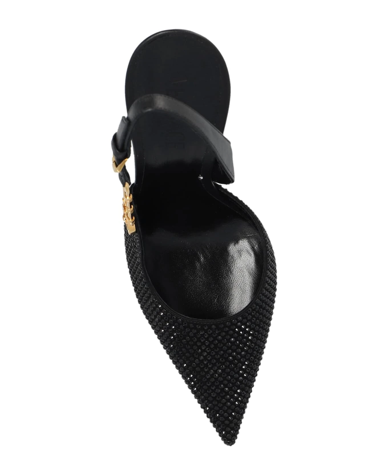 Black slingback pumps from Versace. Made of leather with a pointed toe silhouette, this model sits on a black leather sole and showcases a decorative gold-tone safety pin with the brand’s Medusa and Greca motifs, buckle strap fastening and glistening blac