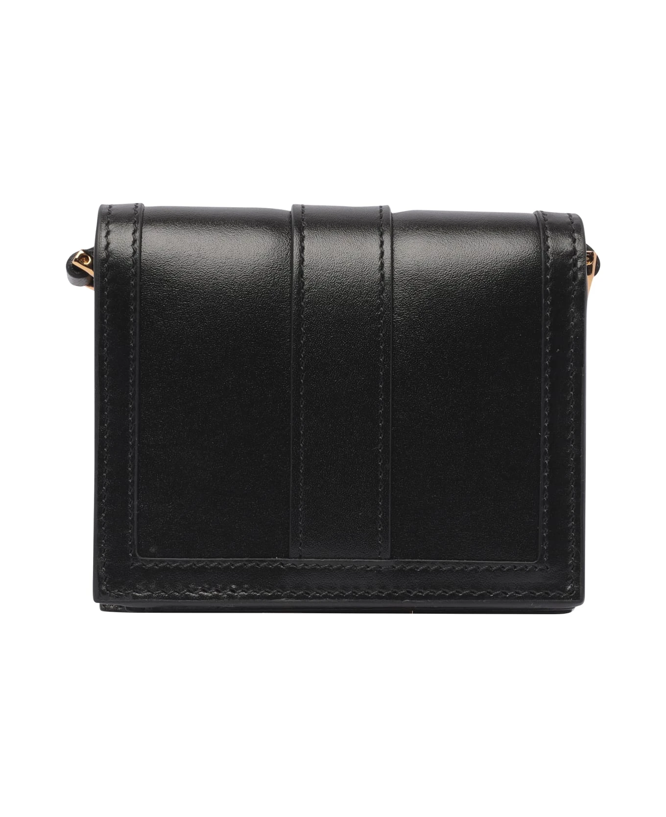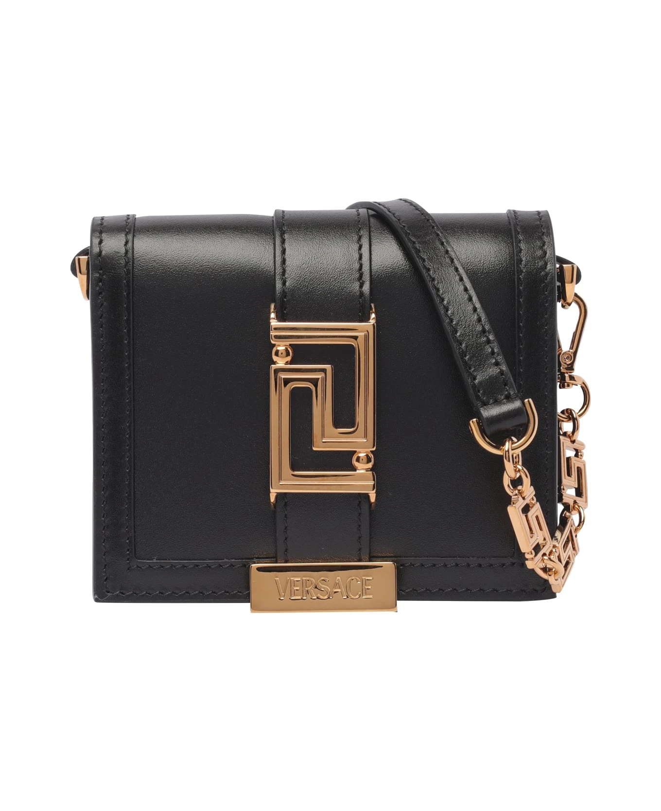 Versace black Greca Goddess chain wallet, clip closure, 5 slots, zipped chain holder, removable strap