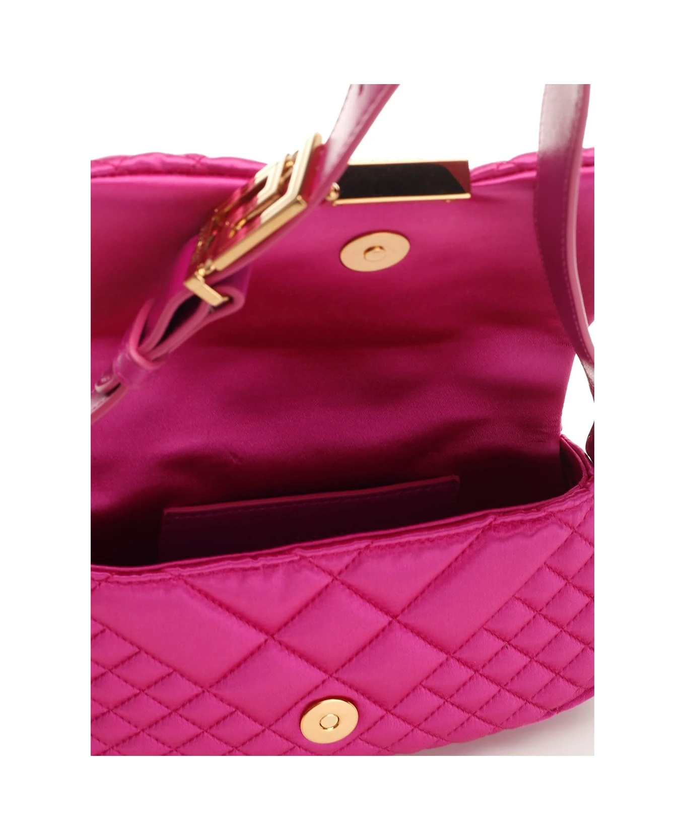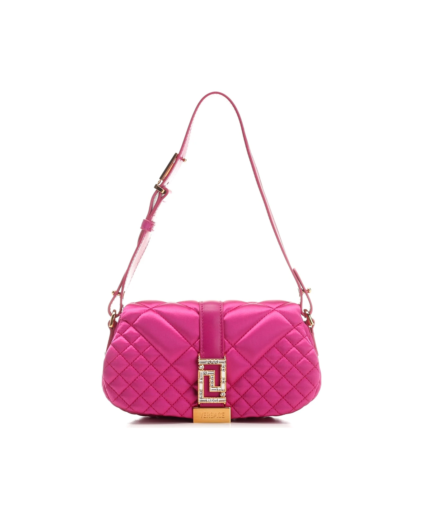 “Greca Goddess” mini shoulder bag from Versace, in hot pink quilted leather, with internal pocket, adjustable shoulder strap, magnetic button under the flap embellished with the Greca detail in gold metal.