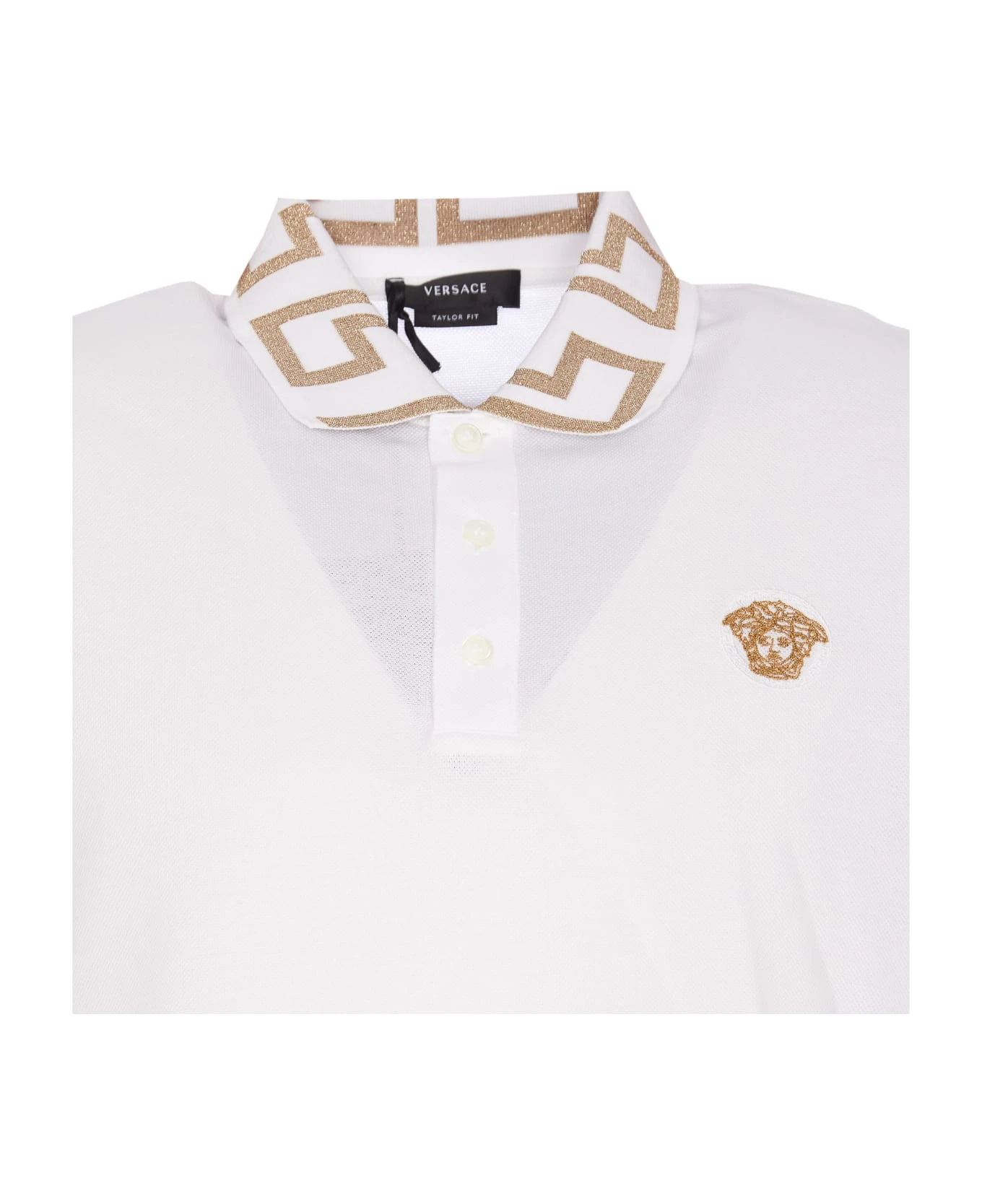 Versace white polo, regular collar, frontal patch logo, buttons closure, short sleeves