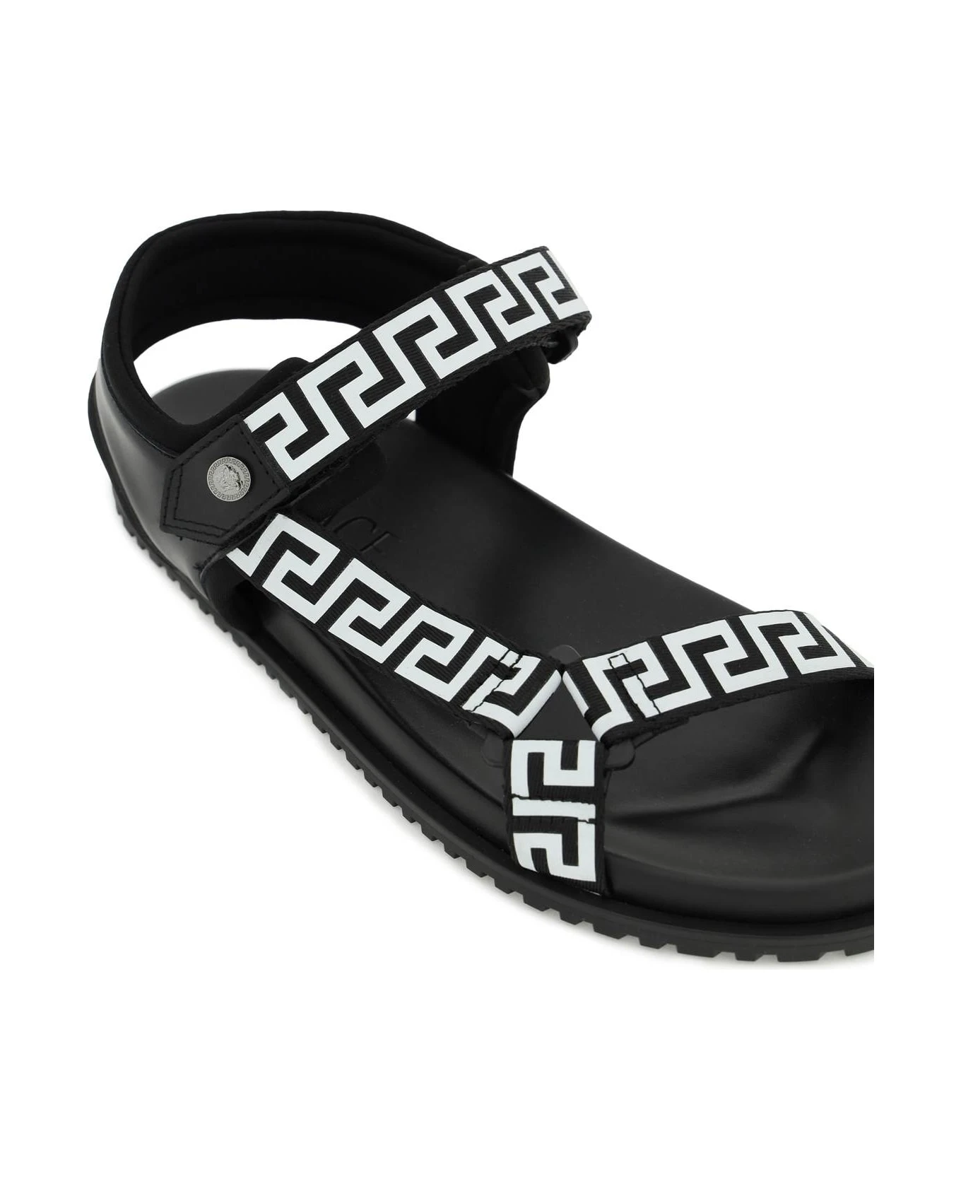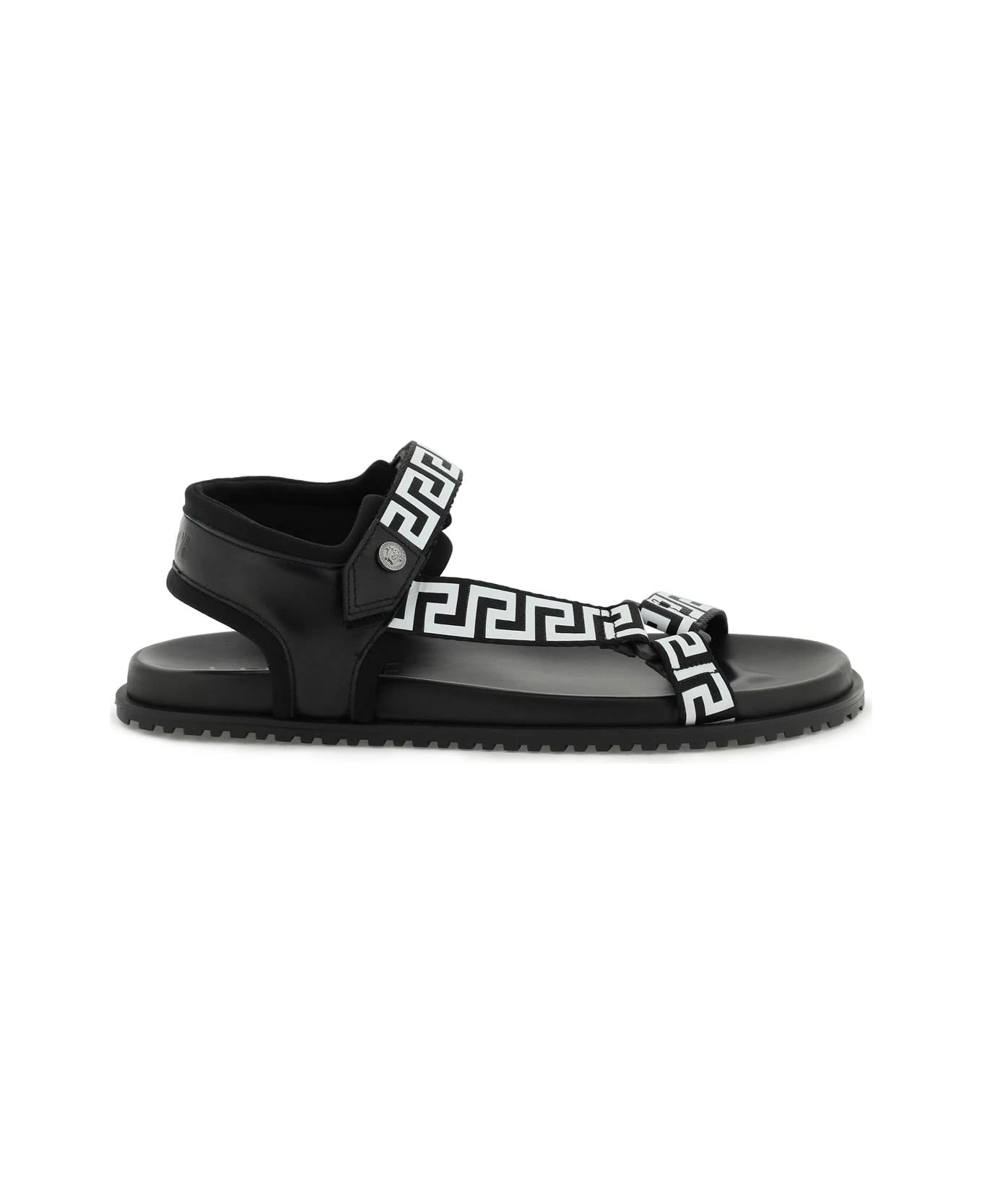Sandals by Versace featuring cross-over jacquard bands with Greca pattern and embellished with the iconic Medusa element. Anatomical leather footbed and rubber sole.