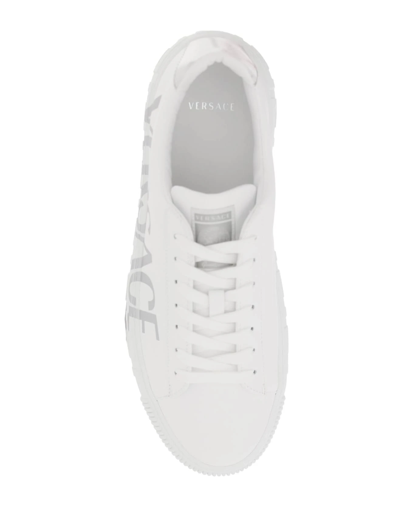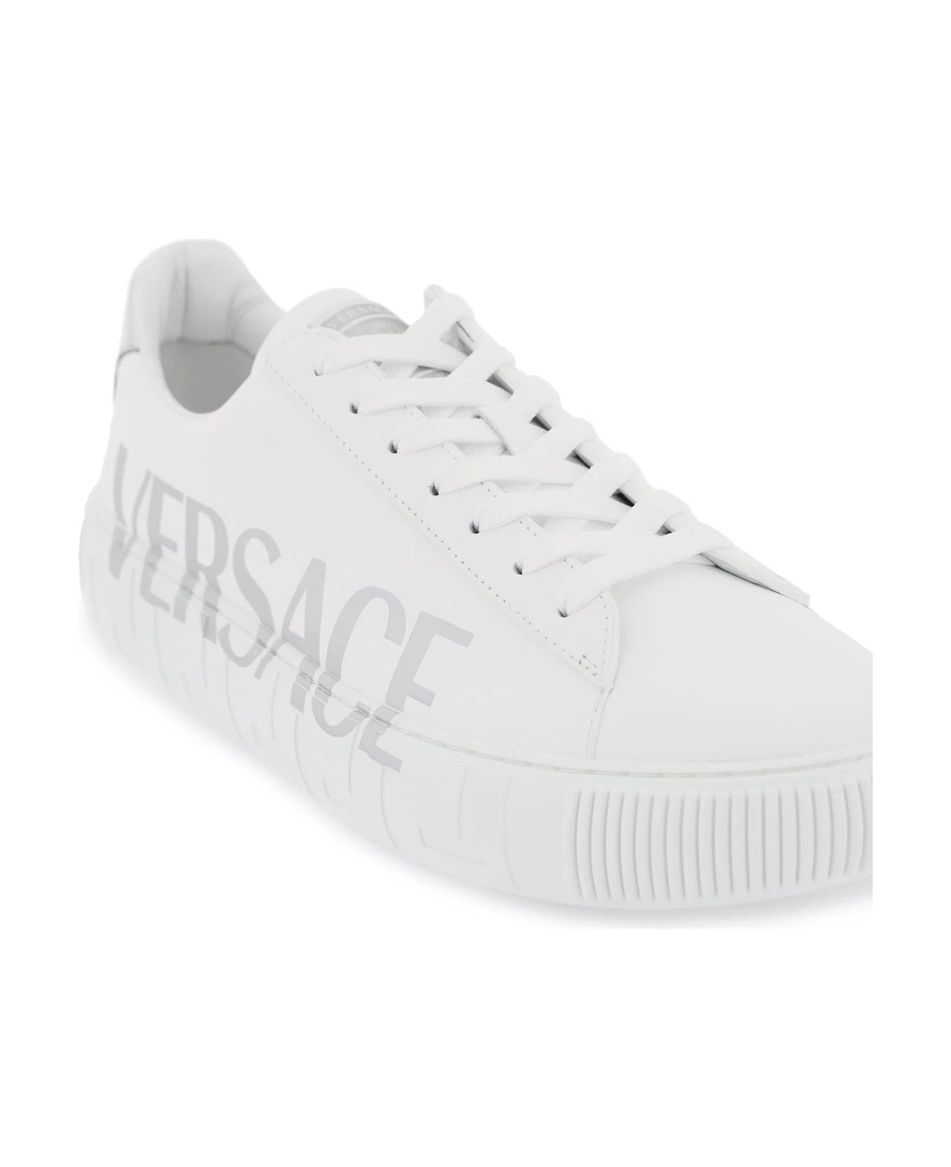 Greca sneakers by Versace crafted in smooth calf leather and decorated with silver-tone lettering logo on the side and laminated logoed heel tab. They feature lace-up closure, fabric logo label on the tongue, leather lining with removable insole, rubber sole with embossed ‘Greca’ pattern and the iconic Medusa embedded on the bottom.