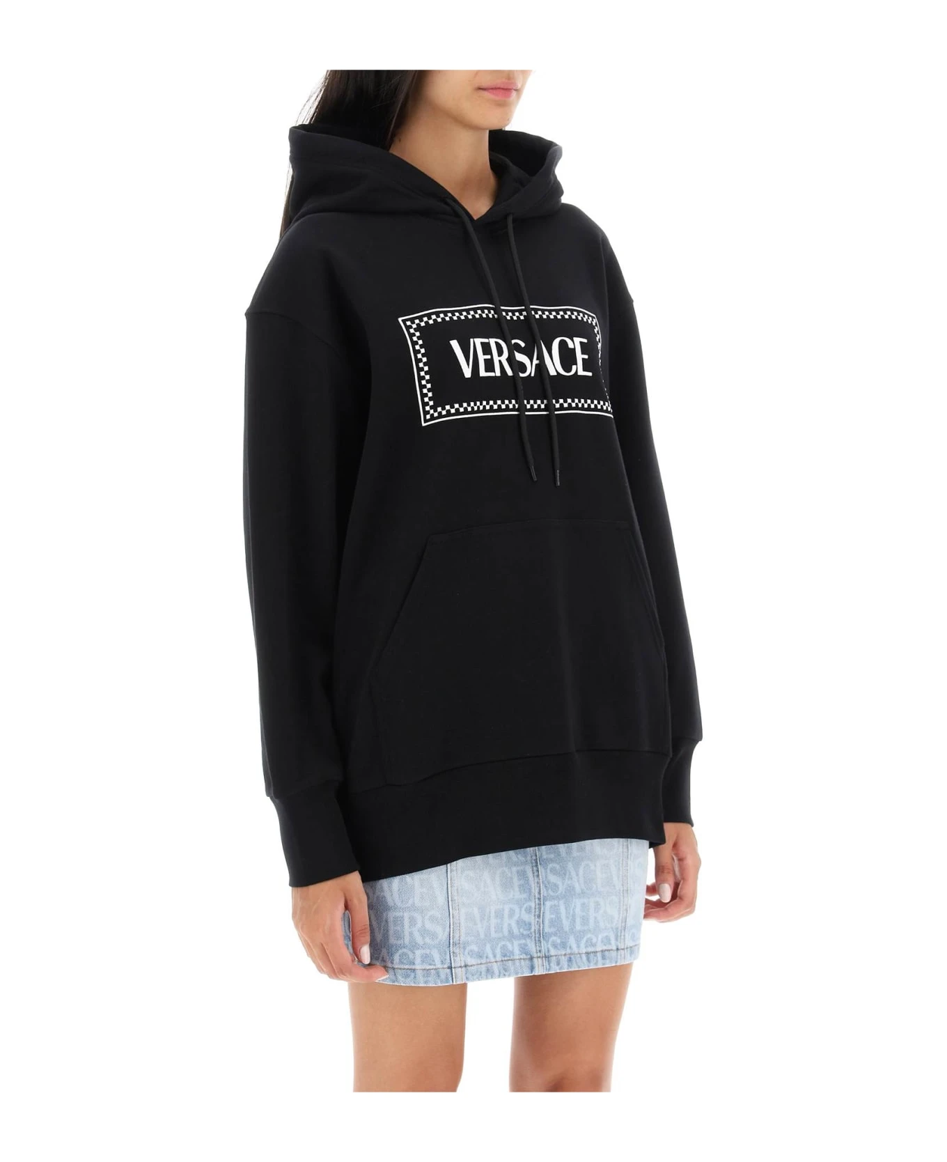Versace sweatshirt crafted in pure cotton french terry with contrasting logo embroidery at chest. It features adjustable hood with drawstring, front kangaroo pocket and ribbed trims. Oversized fit enhanced by dropped shoulders. The model is 177 cm tall and wears size IT 38.