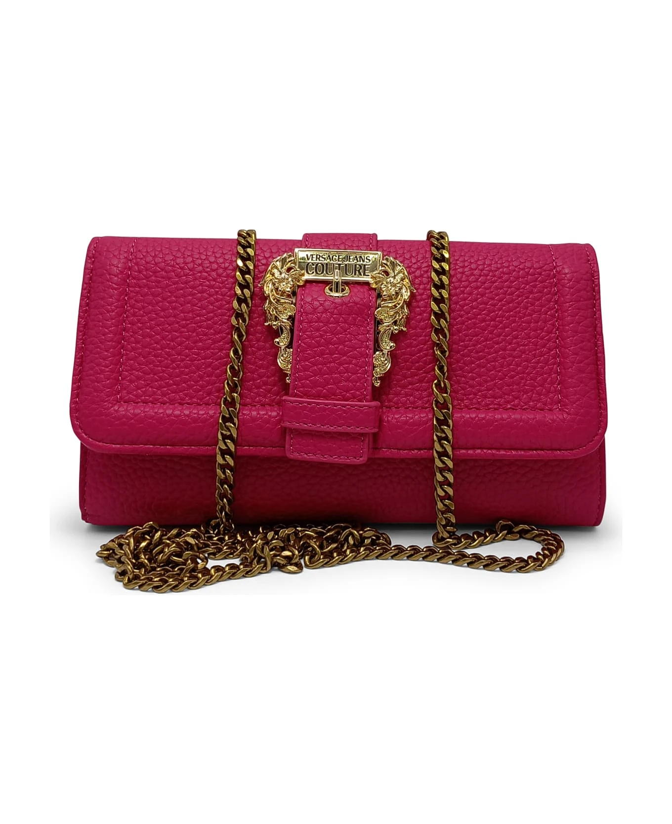 pelle cruelty-free, dettagli color oro, battente nella parte superiore con chiusura magnetica, fessure portacarte interne e tracolla a catena.