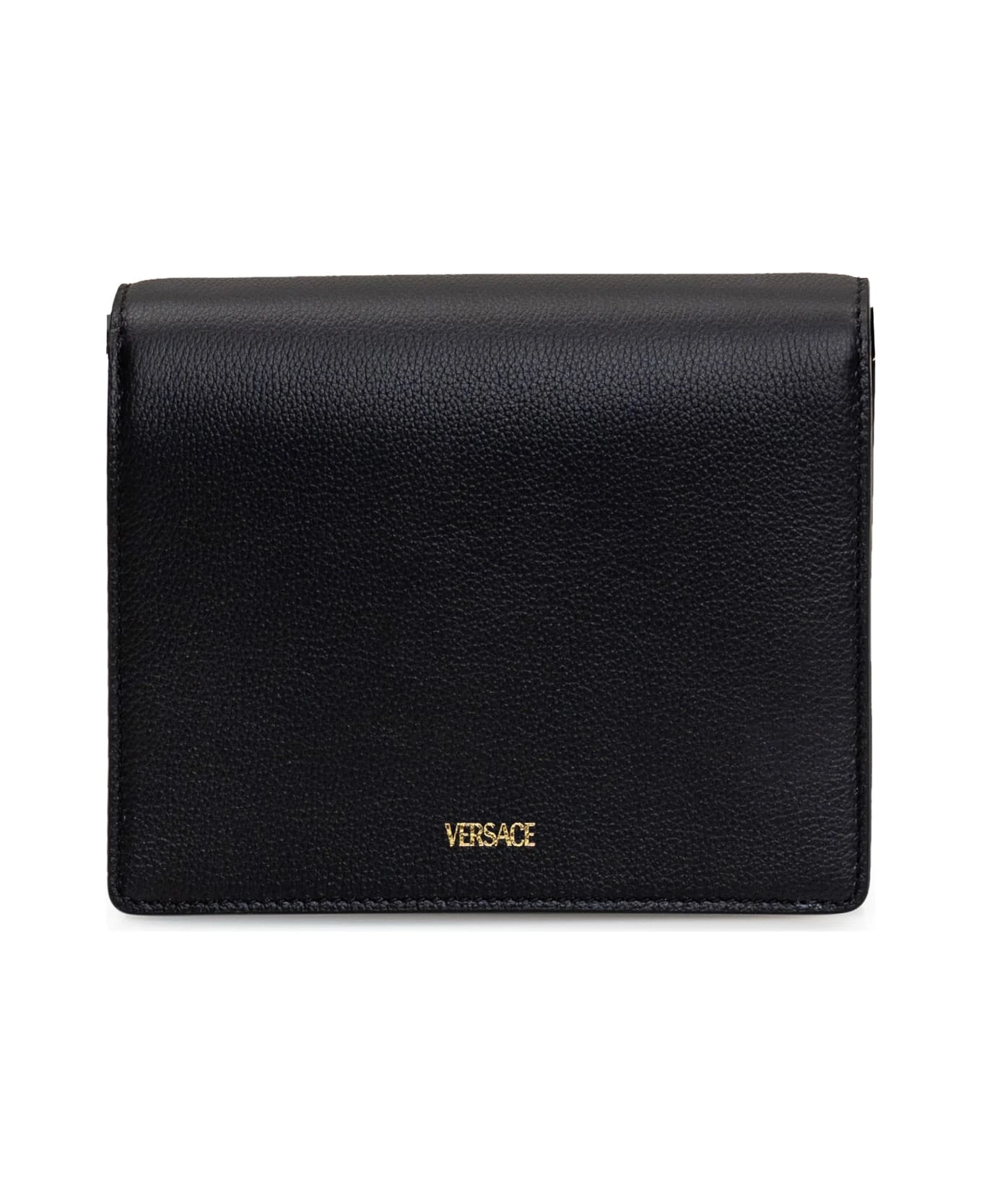 Mini black bag. Adjustable and removable shoulder strap. Closure with flap and button. One compartment with two pockets. Medusa on the front.