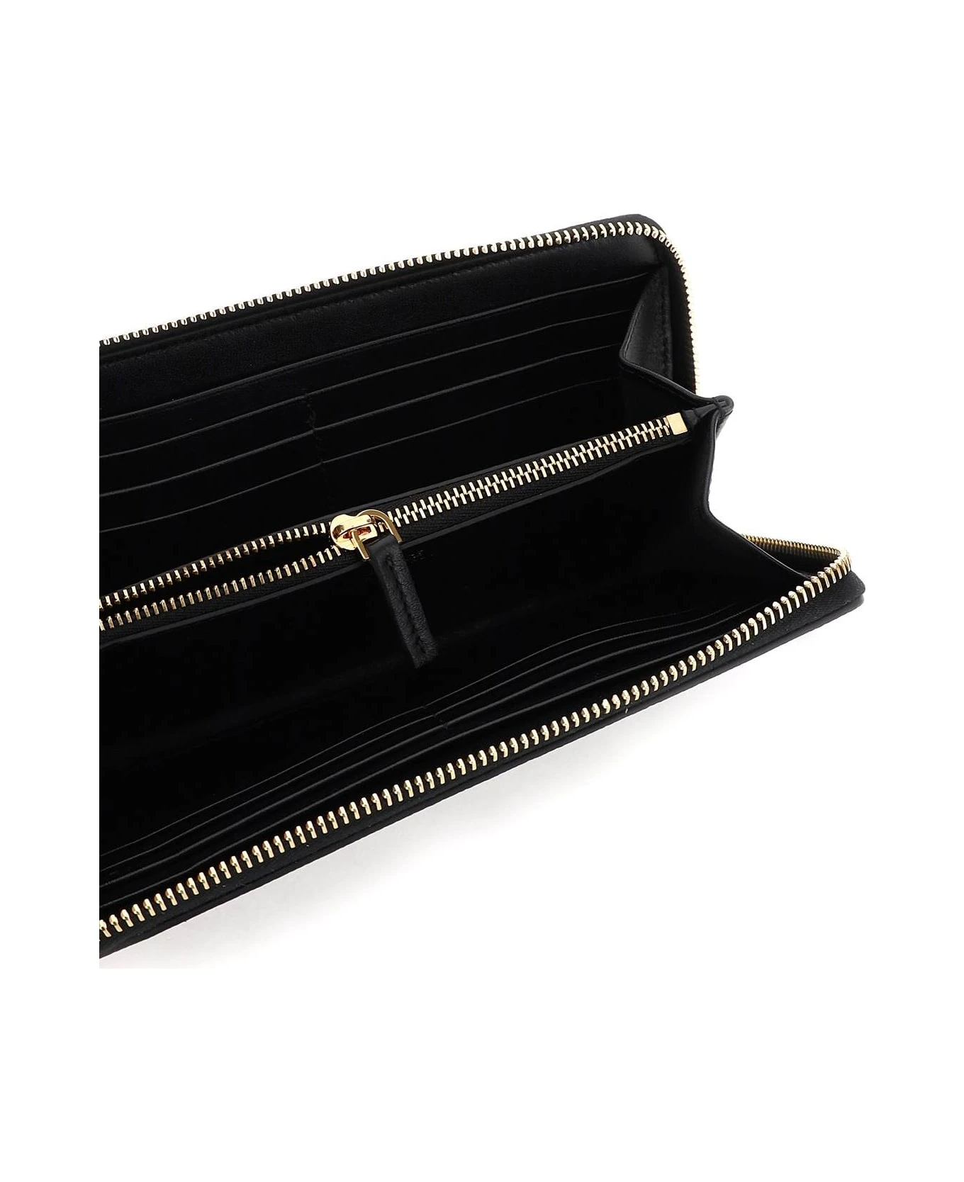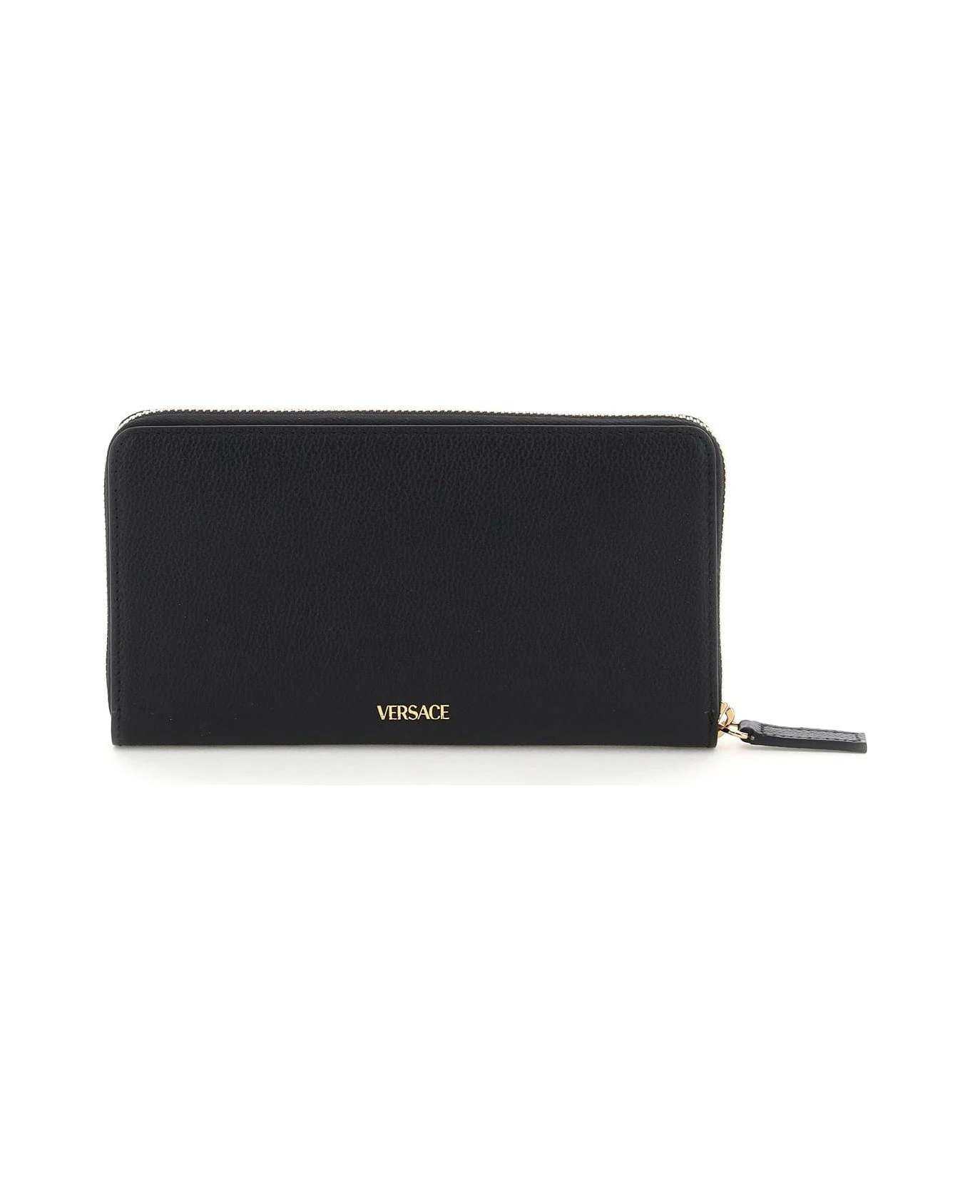 Versace zip-around wallet in calf leather with gold-tone metal Medusa appliqué. The interior is organised in two gusseted compartments with a central coin pocket, two large slip pockets and 12 card slots. Logo print on the back.