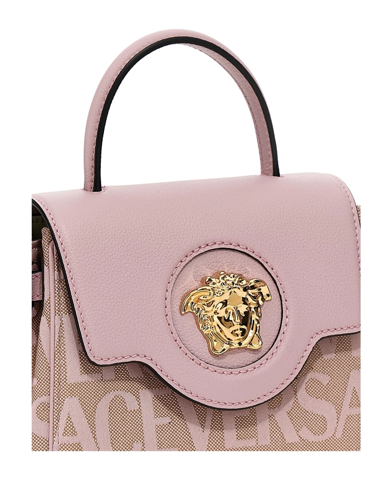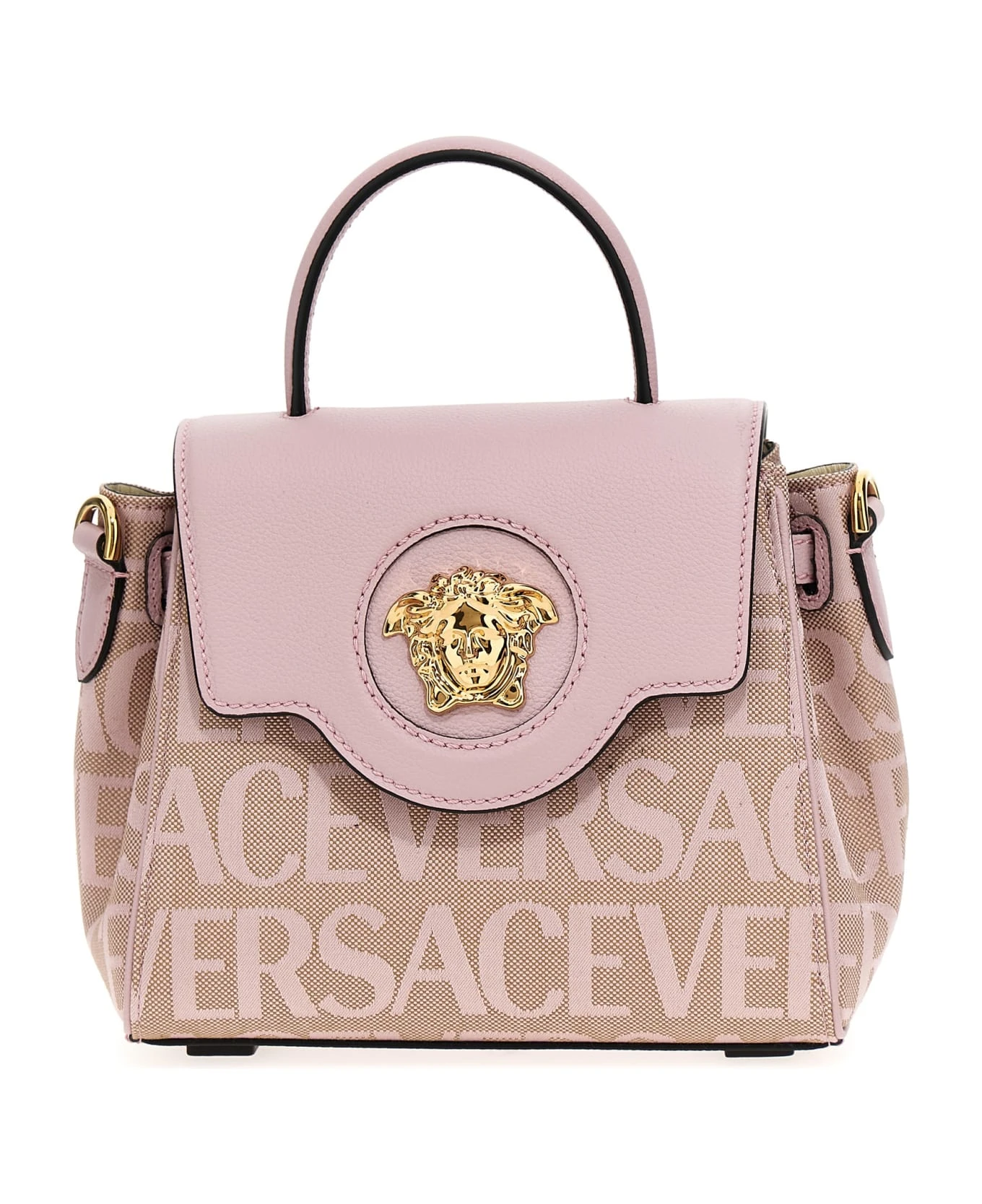 La Vacanza capsule handbag with ‘Versace Allover’ pattern, decorated with ‘La Medusa’ plaque, chain shoulder strap, leather shoulder strap and a magnetic closure.