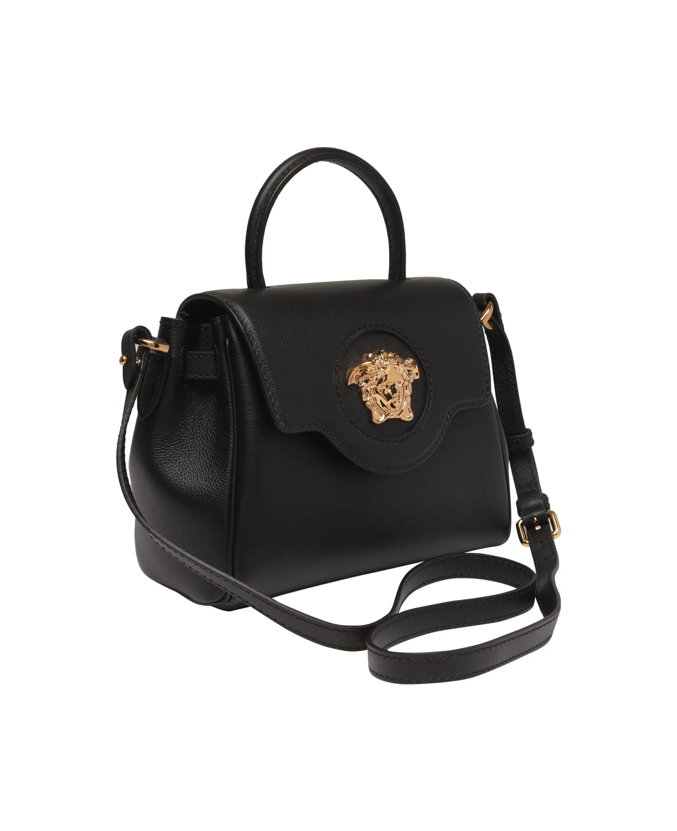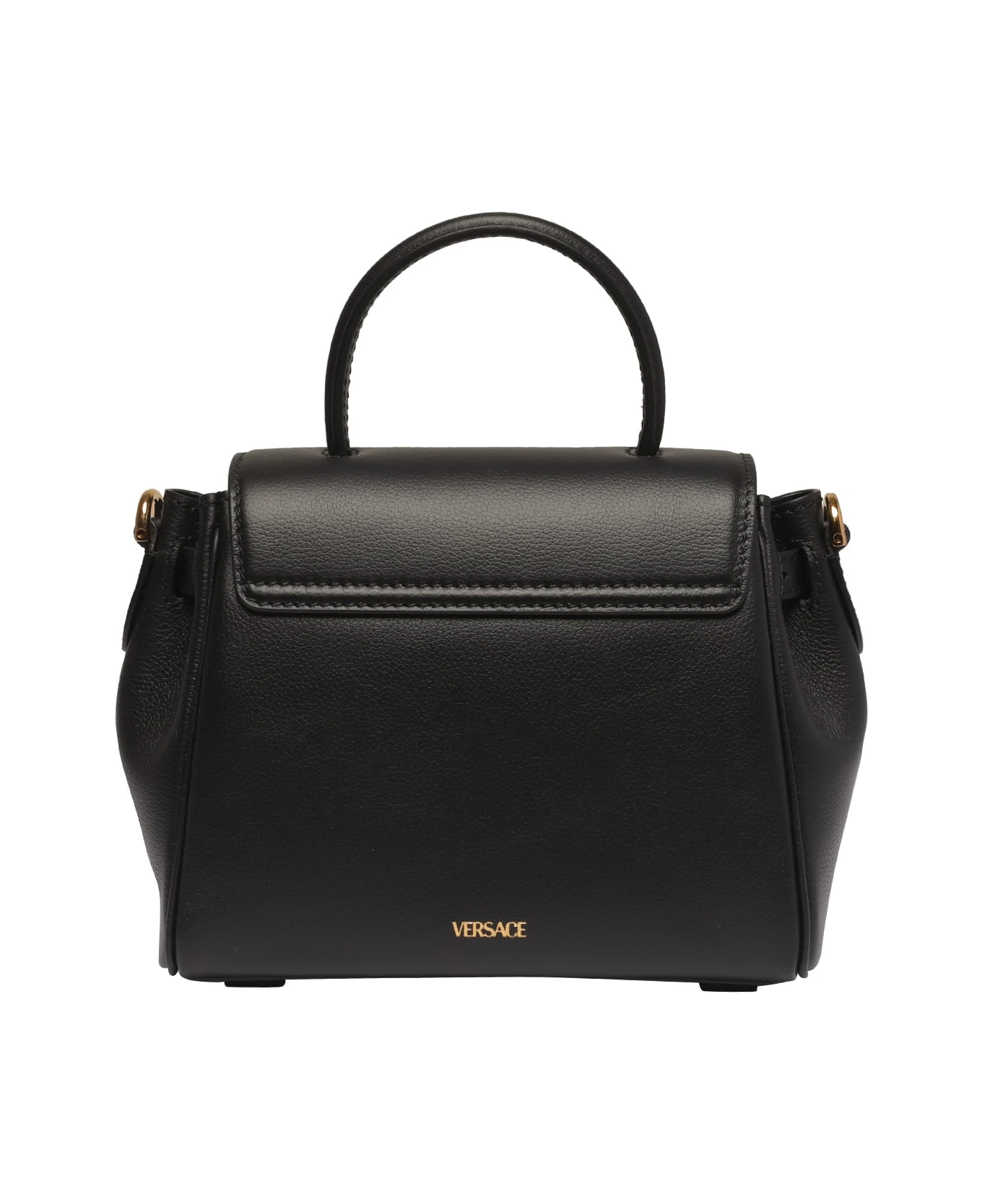 Versace black Medusa handbag, magnetic closure, open pocket, removable chain shoulder strap, adjustable and removable leather shoulder strap detail, frontal golden plaque Medusa logo