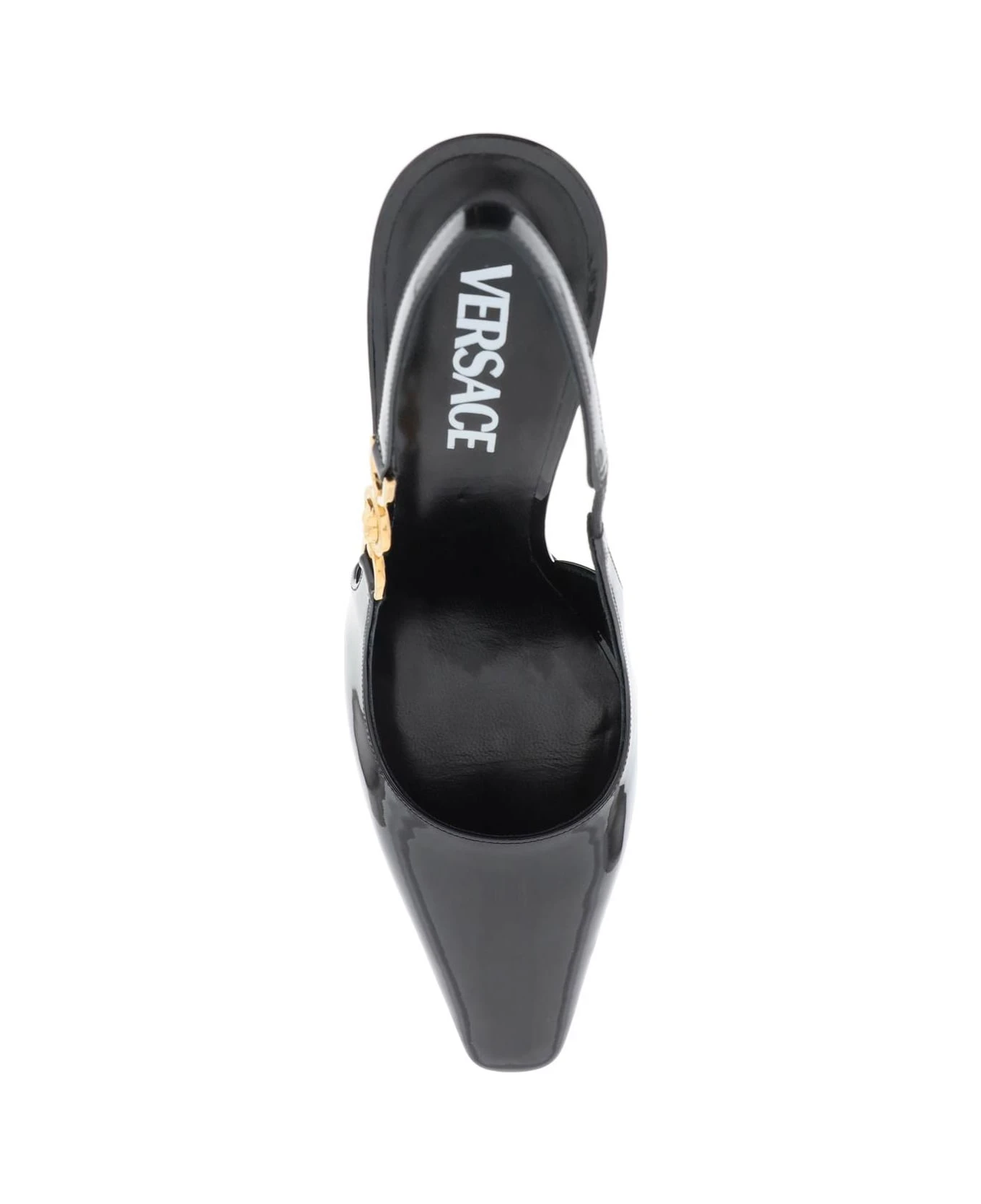 Versace patent leather slingback pumps with square toe and gold metal Medusa ’95 detail. Leather footbed and leather sole.