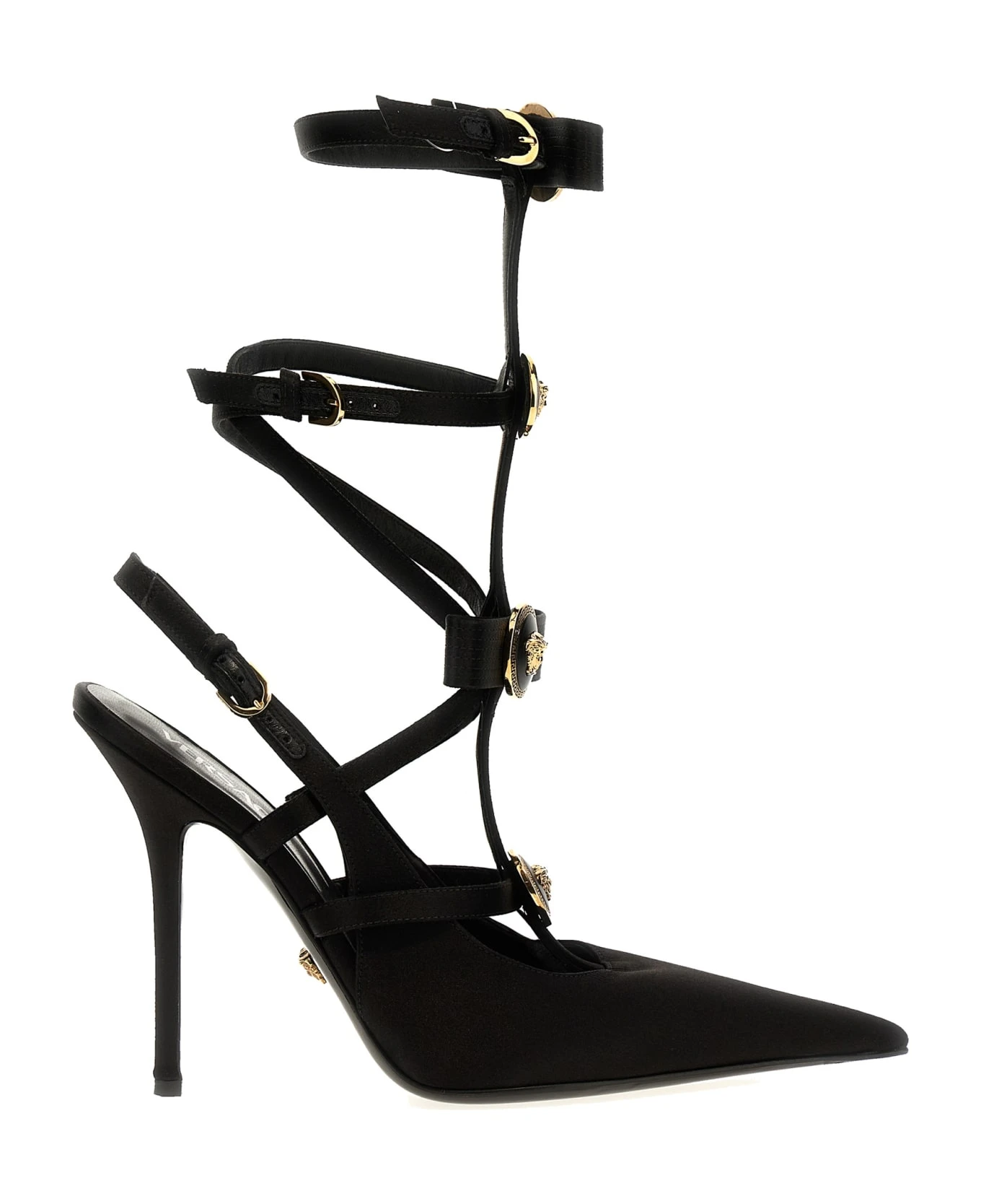 Satin pumps with ‘Medusa’ button detail, adjustable strap, stiletto heel.