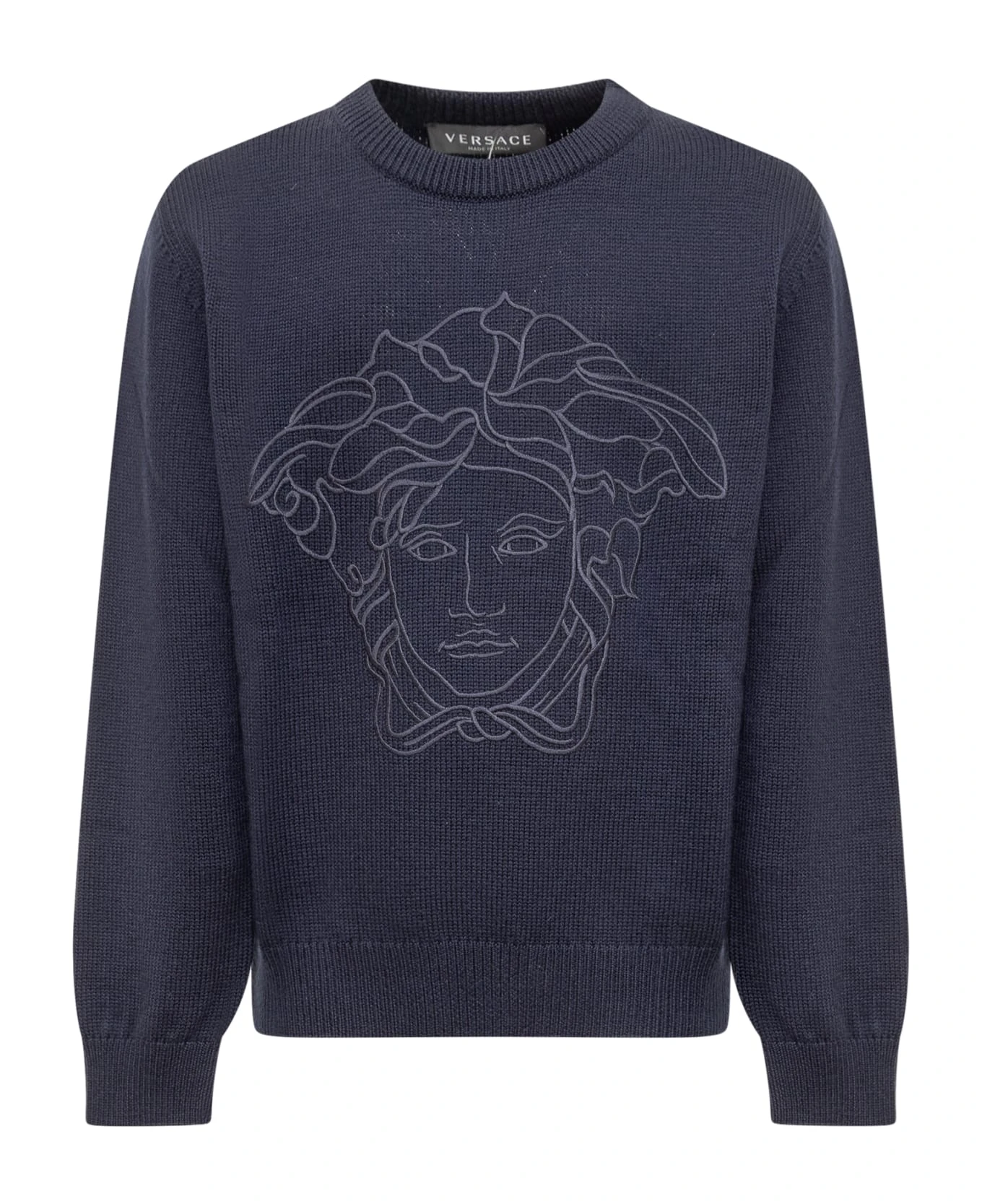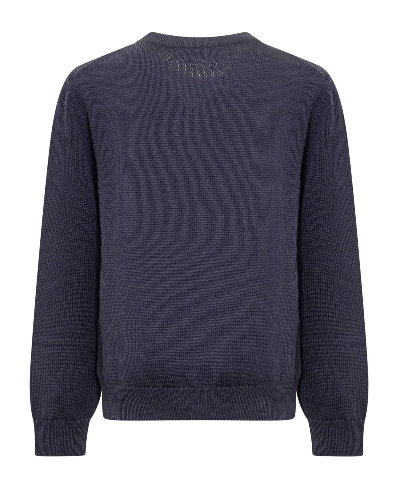 Blue sweater with long sleeves. Crew neck. Embroidered jellyfish logo on the front. Ribbed collar, cuffs and bottom.