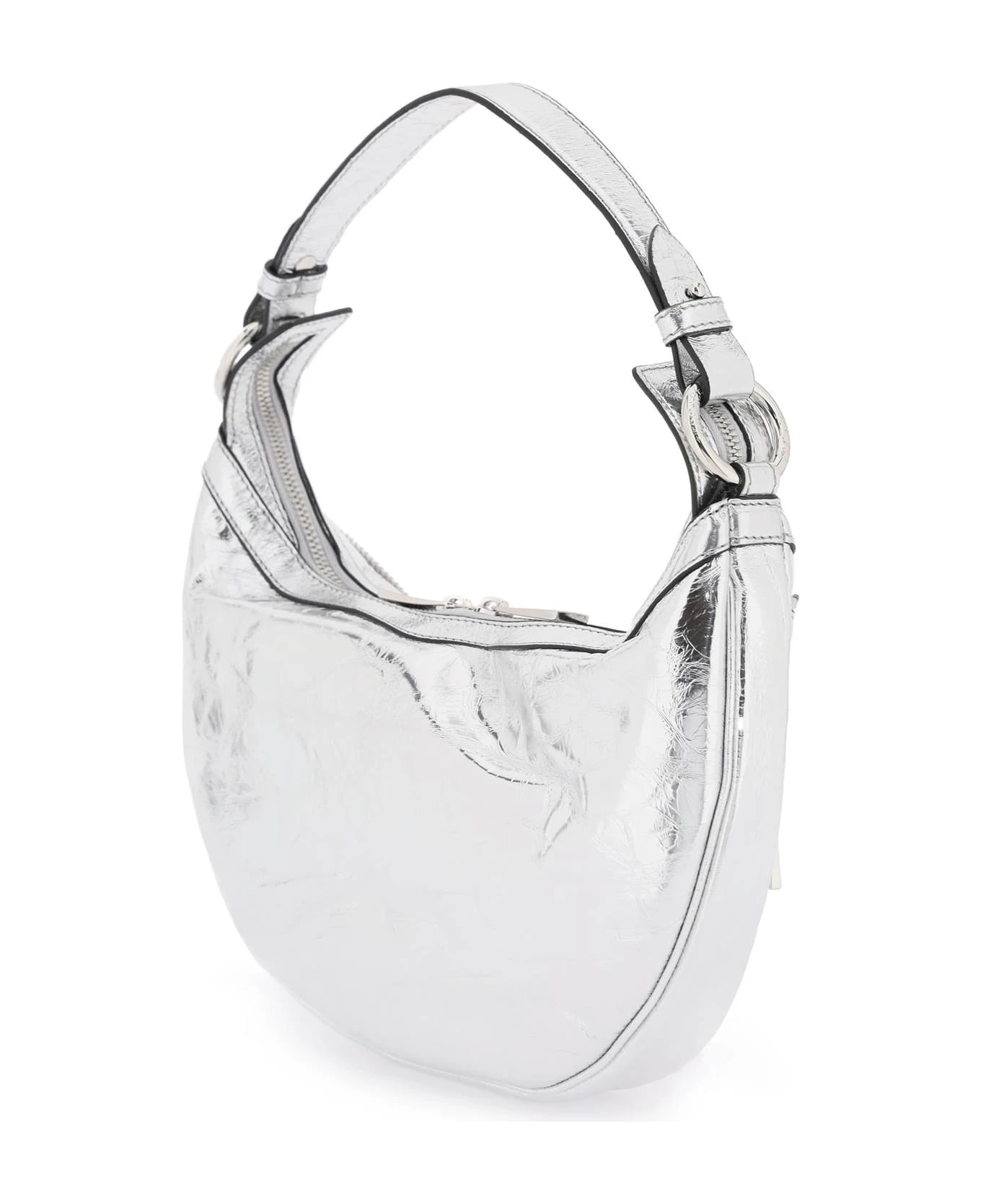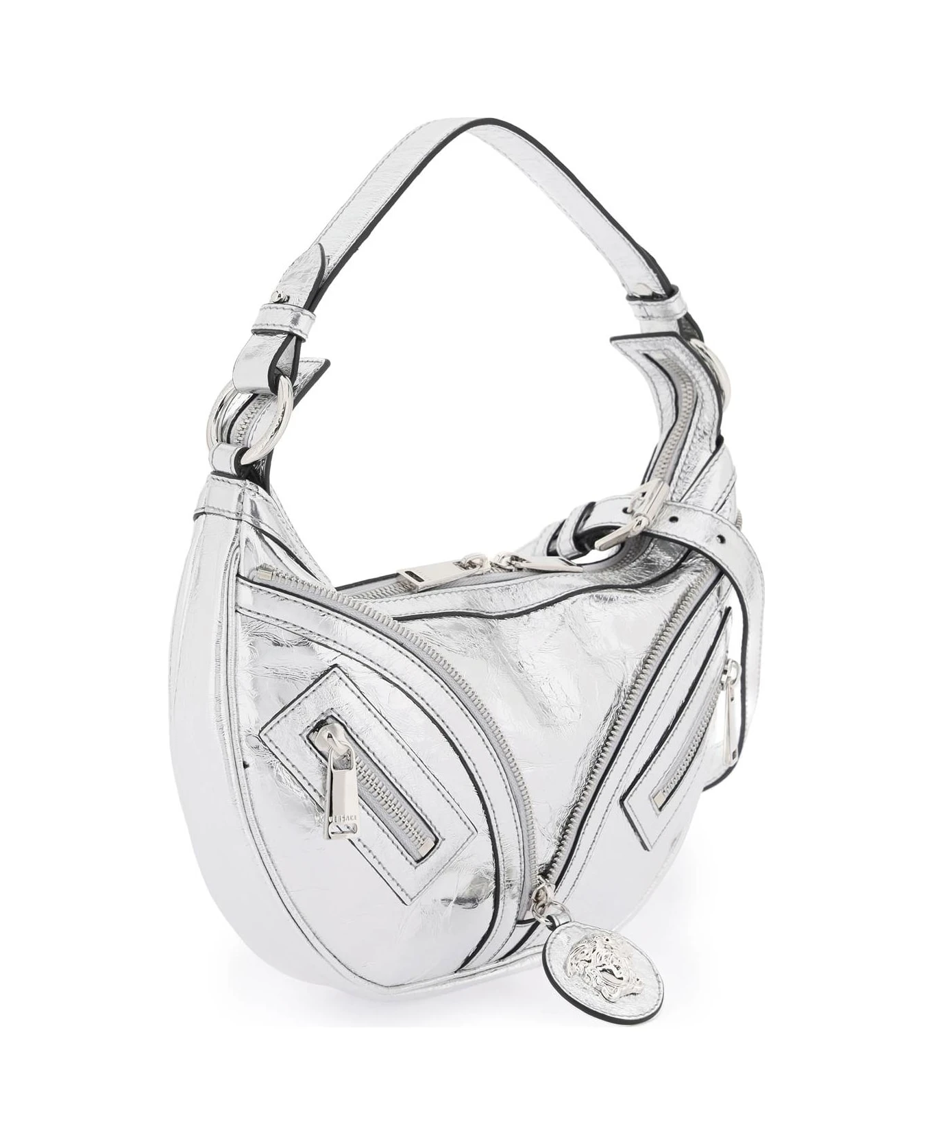 ‘Repeat’ hobo bag by Versace made of metallic leather featuring zipper details and pendant with iconic Medusa. Zippered closure, fabric interior with one zippered pocket, detachable single handle and additional, adjustable shoulder strap. Silver-finished metalware.