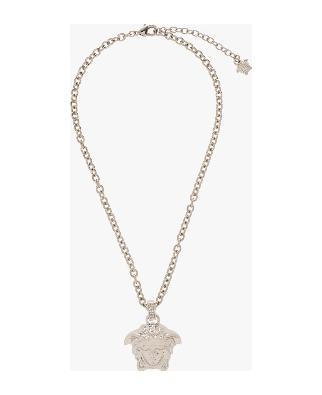 Silver-tone necklace from Versace. This item features the brand’s signature Medusa head embellished with crystals and an adjustable lobster clasp closure.