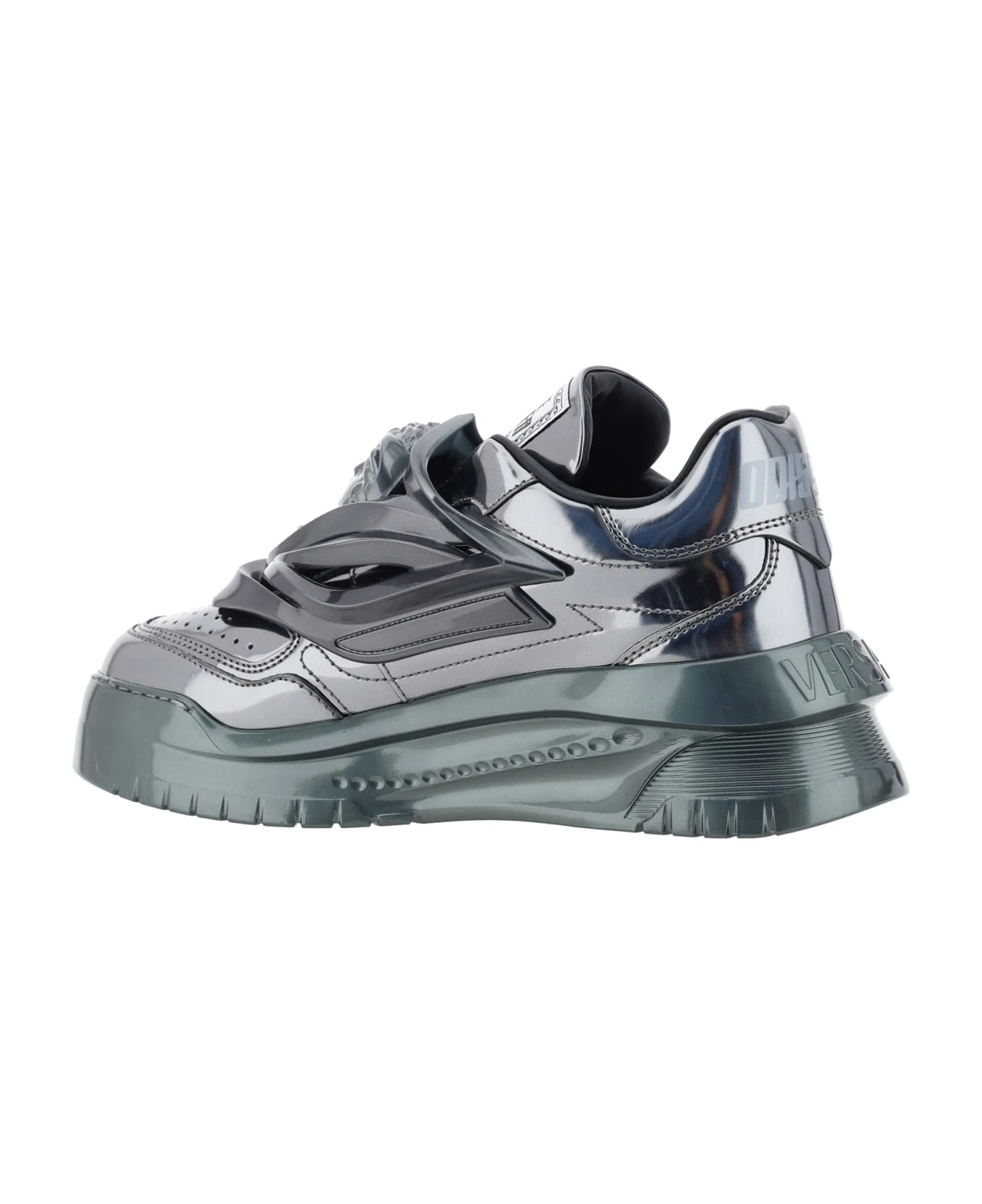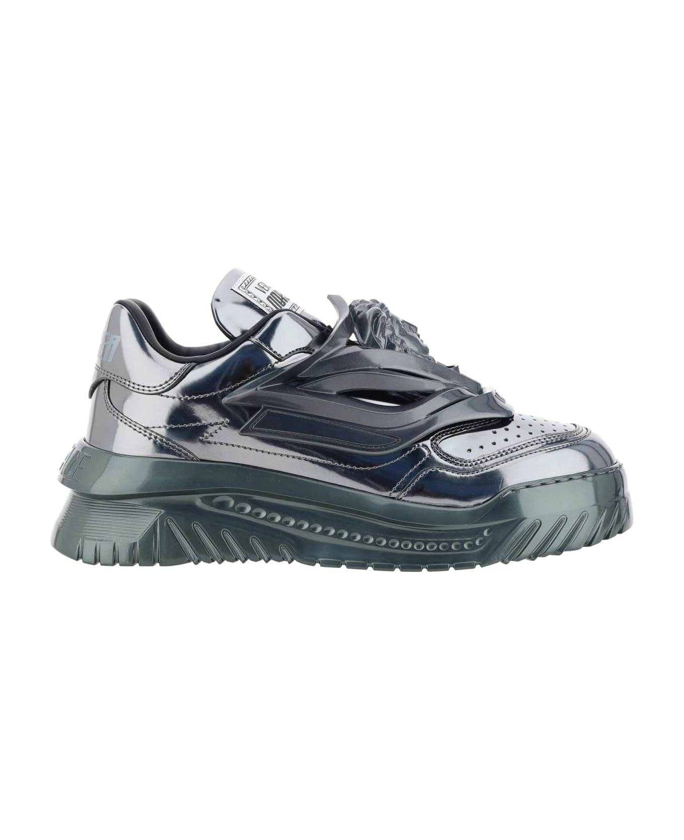 Odissea sneakers by versace, slip-on style, textured platform sole, perforated round toe, labal on front and back with iconic brand monogram applied, press-stamped logo insole, brand’s iconic medusa head plaque applied on front embossed, shiny metallic effect design.