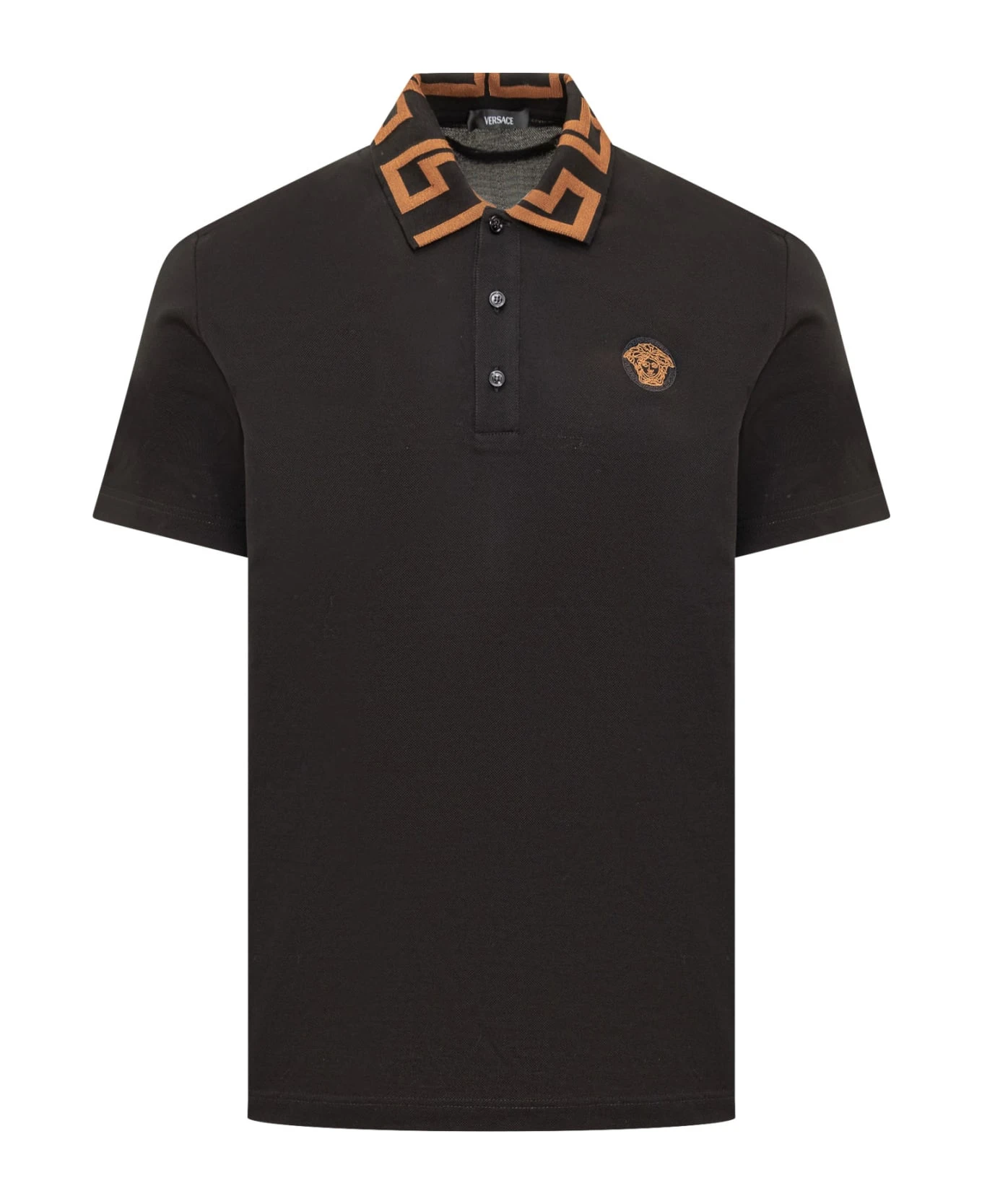 Black polo with short sleeves. Classic collar with pattern. Embroidered logo on the chest. Front closure with buttons.