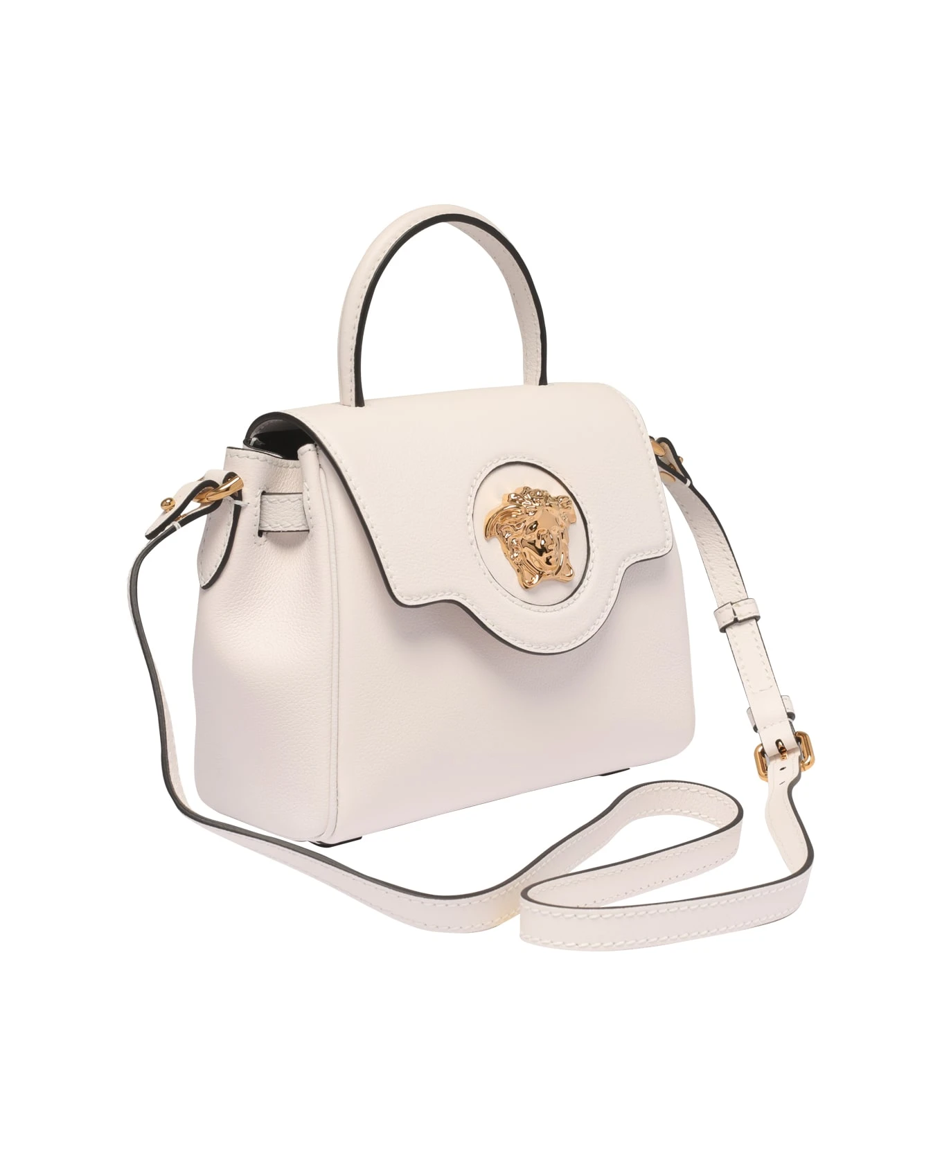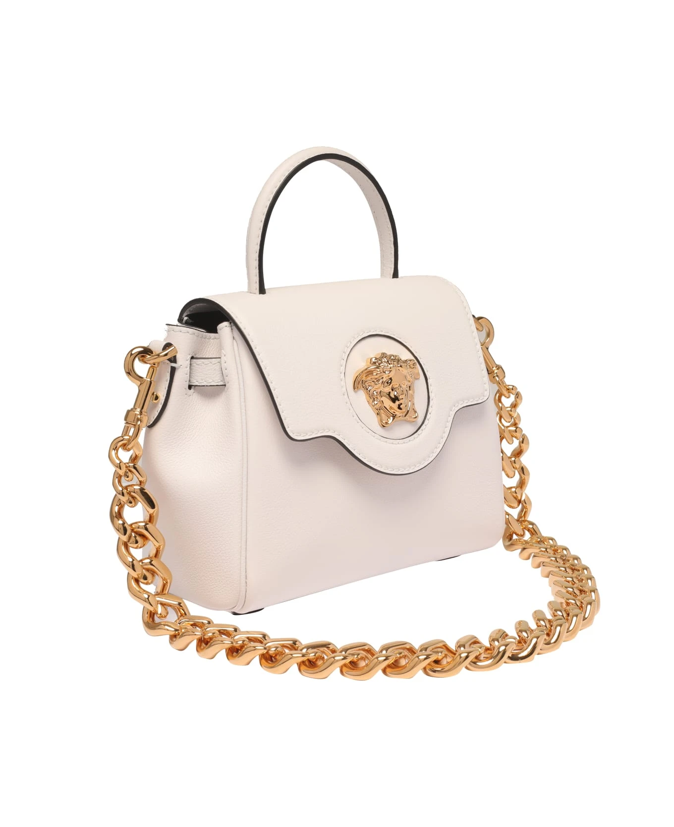 Versace white La Medusa handbag, magnetic closure, open pocket, removable chain shoulder strap detail, adjustable and removable leather shoulder strap, frontal golden plaque Medusa logo, small model