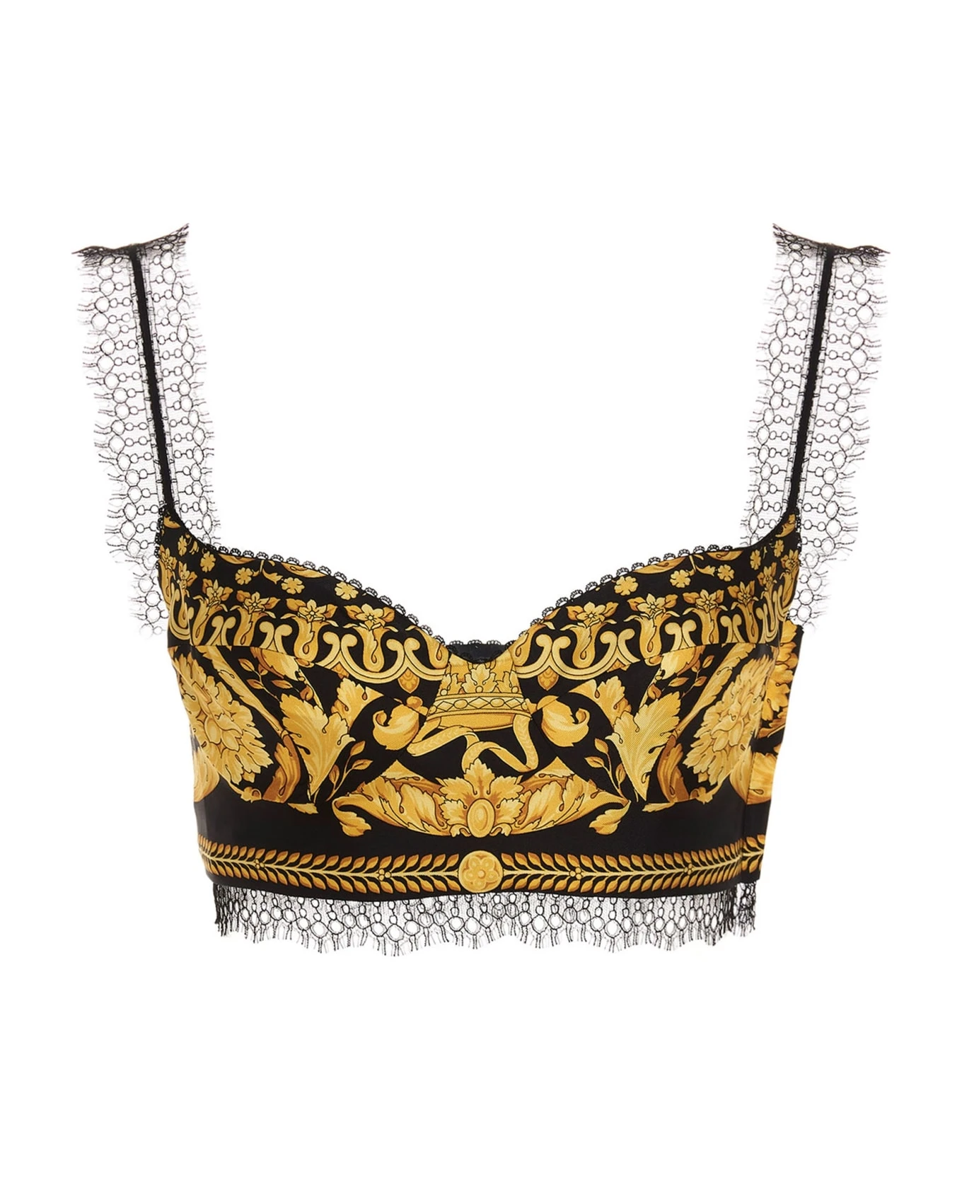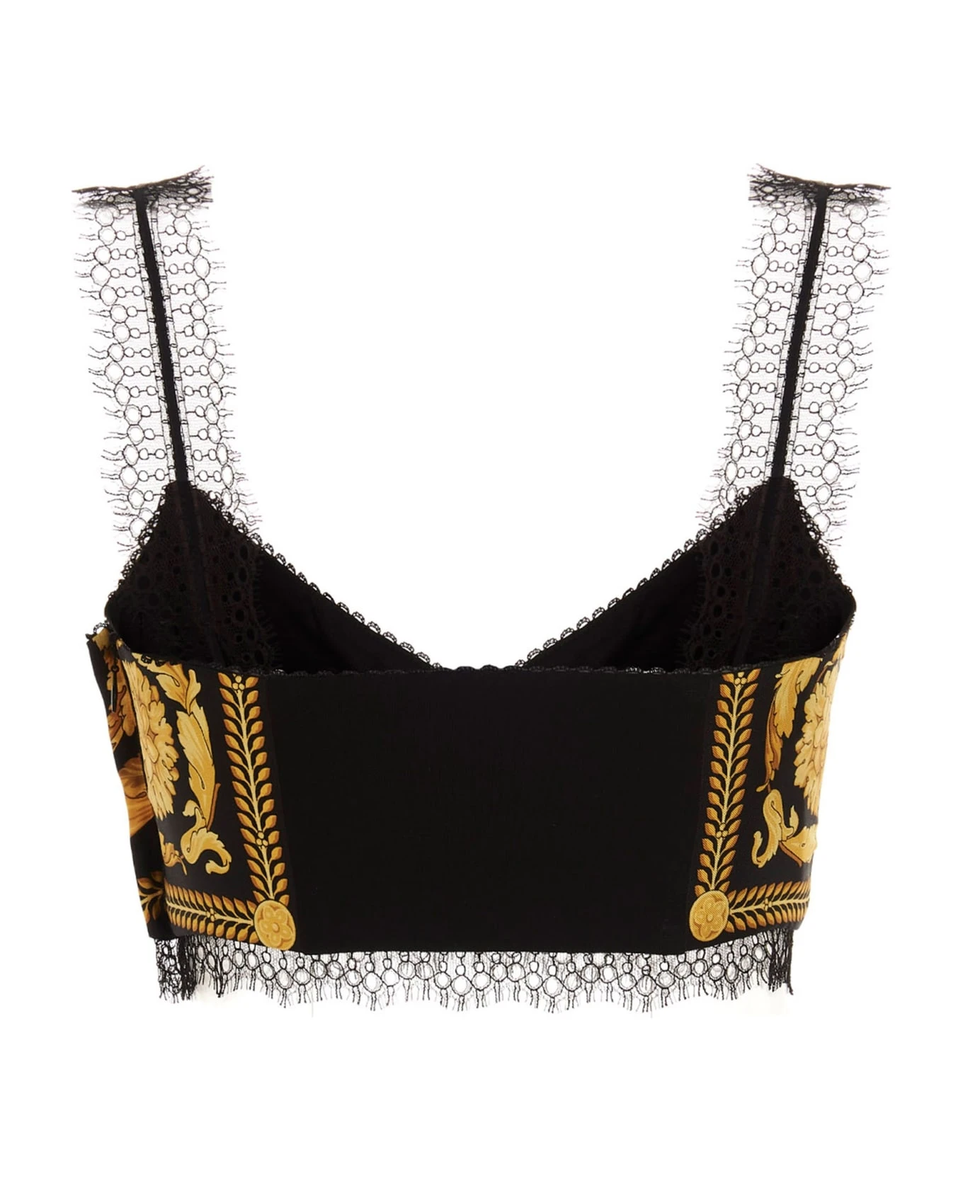 ‘Barocco Heritage’ silk twill top, featuring lace shoulders, side zip closure, inner ferretto and a cropped fit.