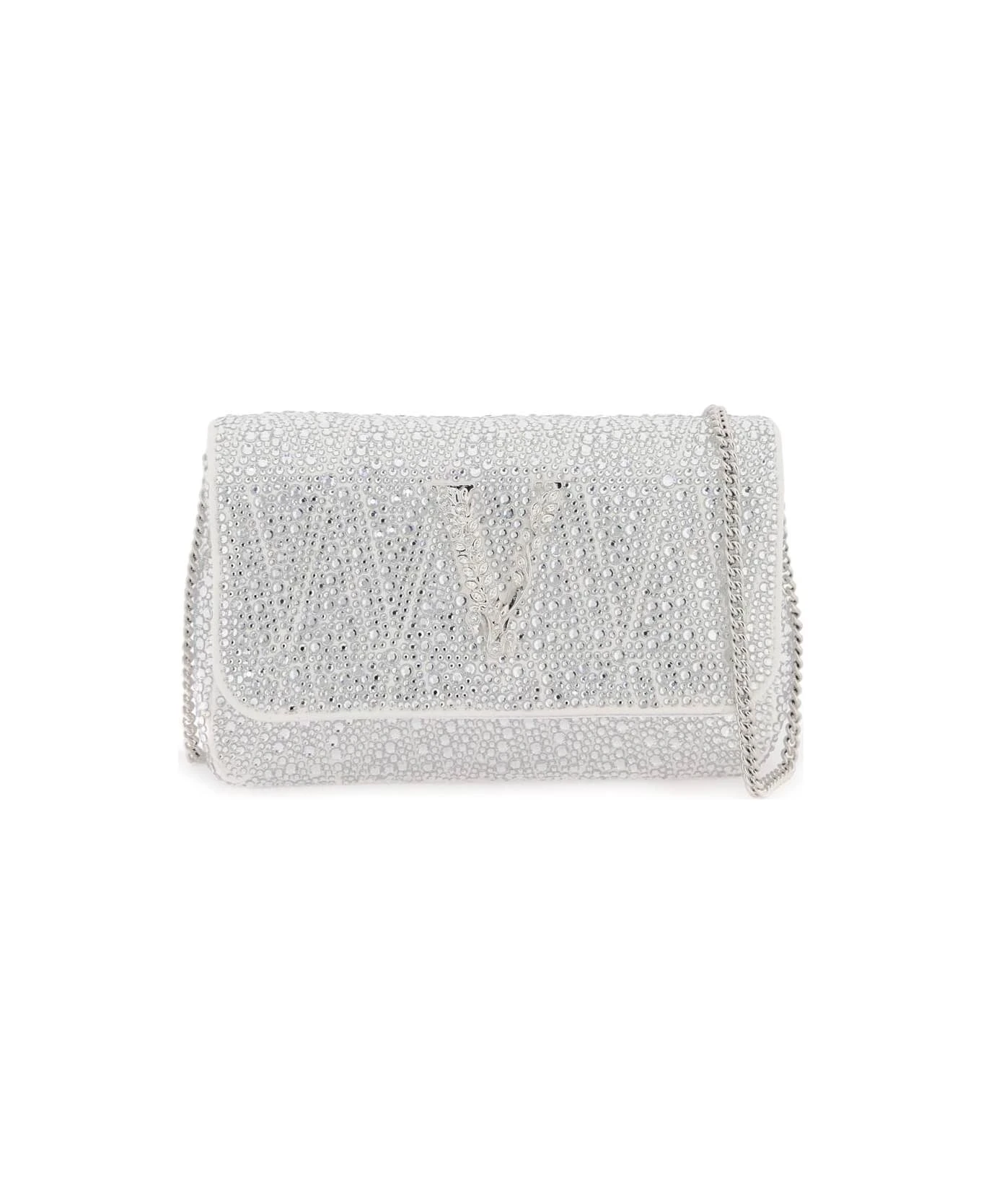 Virtus mini bag by Versace made of silk blend and studded with crystals, featuring Barocco V decoration. Magnetic button closure, lambskin-lined interior, three card slots, removable chain strap. Silver-finished metalware.
