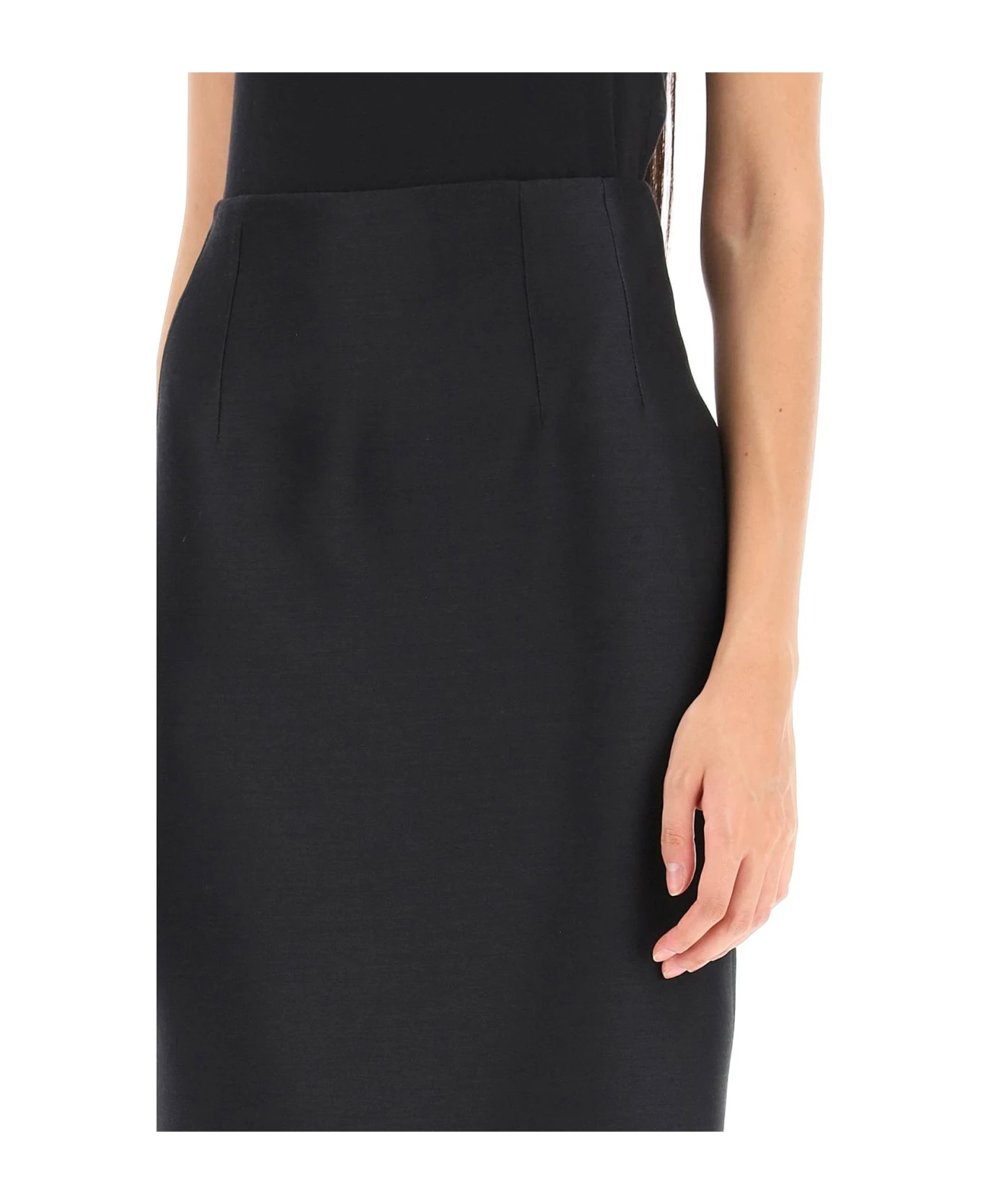 Versace pencil skirt in wool-silk shantung, featuring a high waist and back vent. The hem falls just below the knee. Back invisible zip closure, full lining. The model is 177 cm tall and wears a size IT 40.