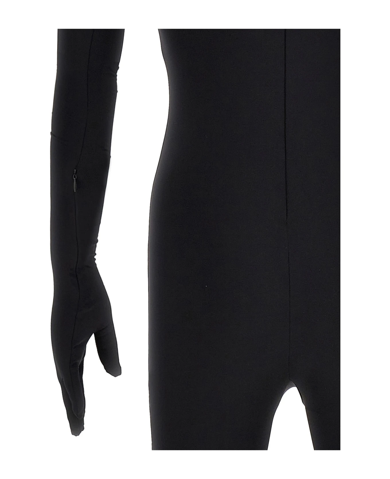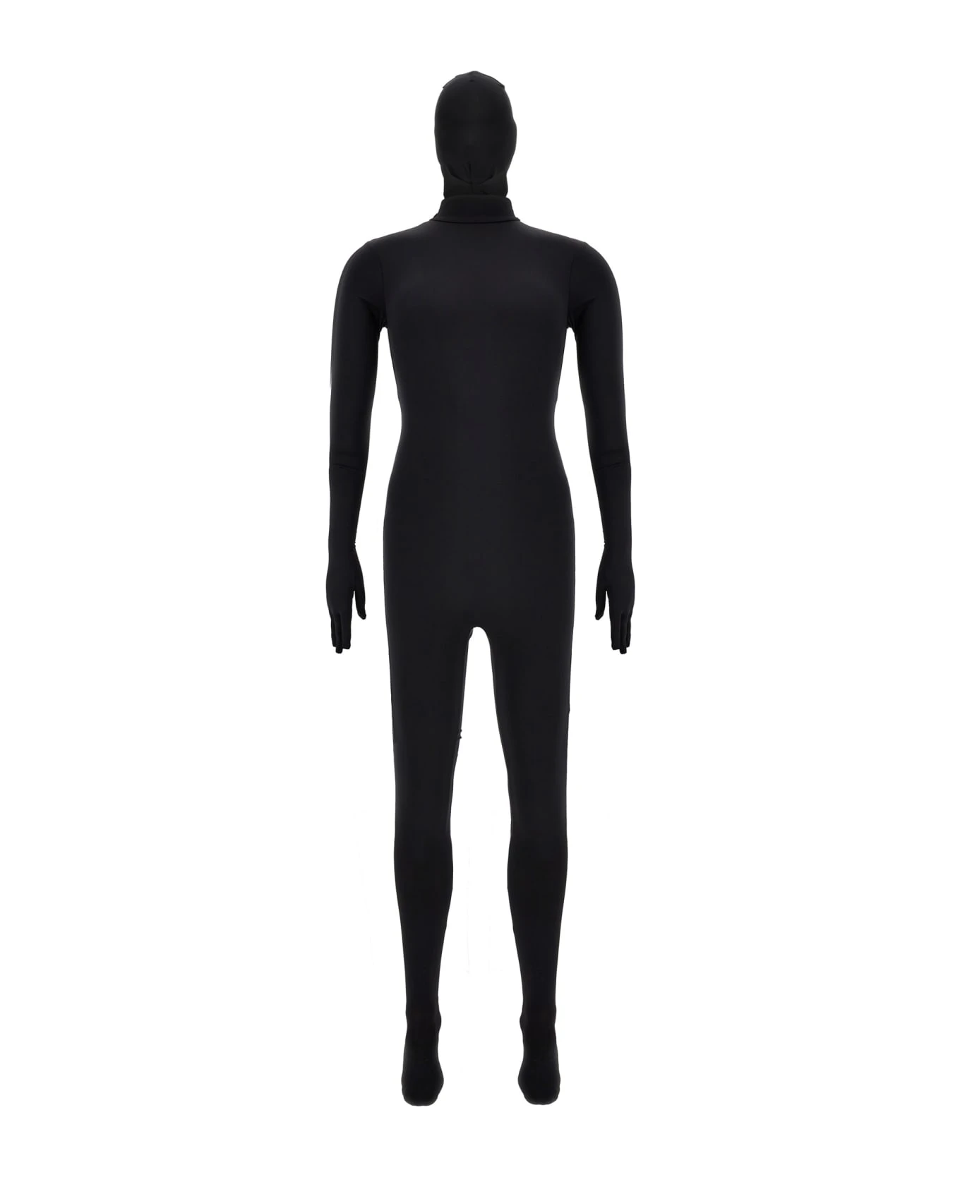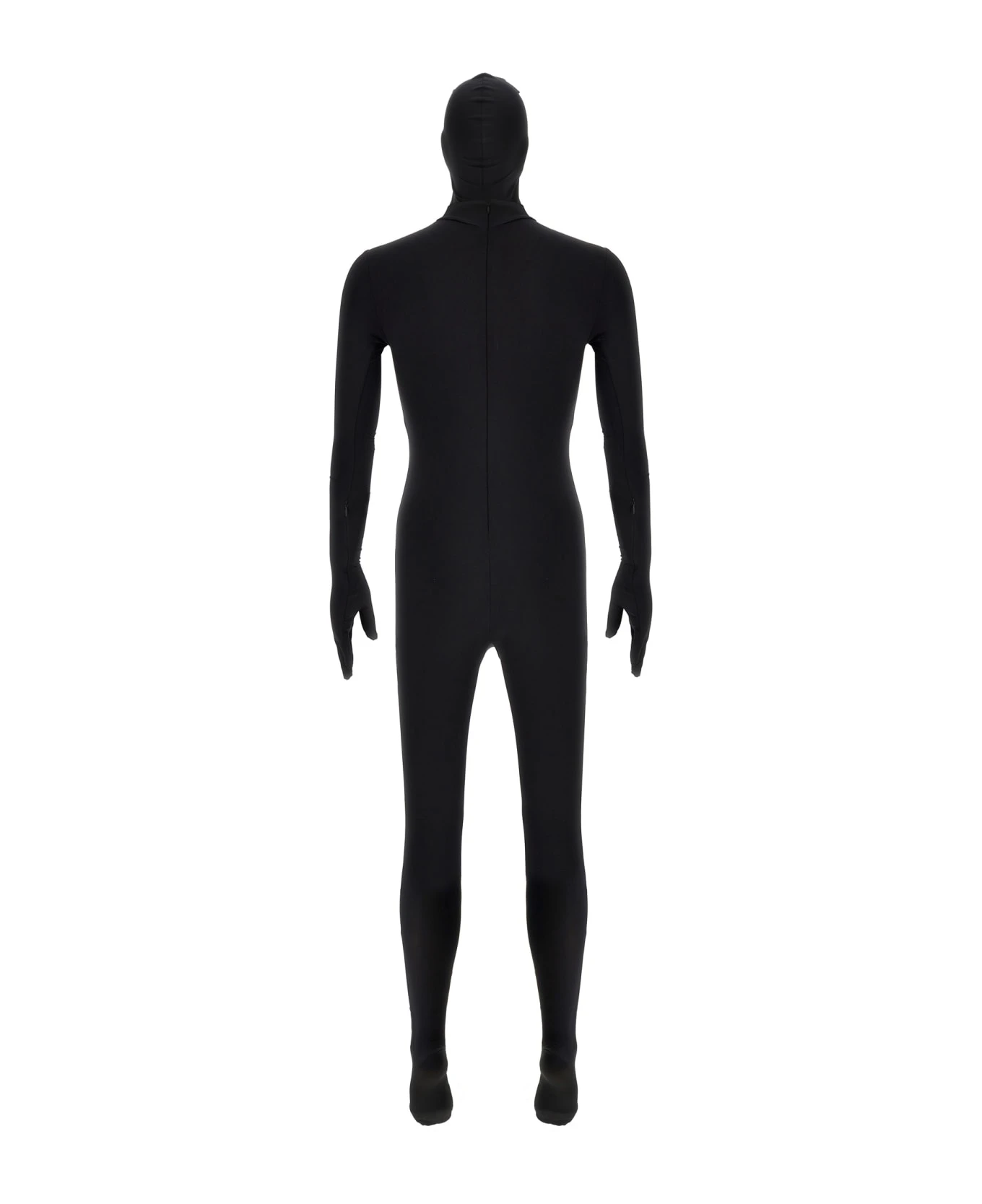 Blackout morphsuit in stretch fabric with long sleeves, gloves, and long foot socks. Featuring removable mask.