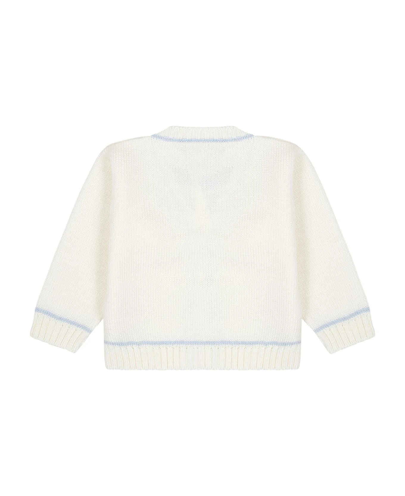 White wool cardigan, long sleeves, V-neck, ribbed cuffs and hem, front button closure, light blue details.