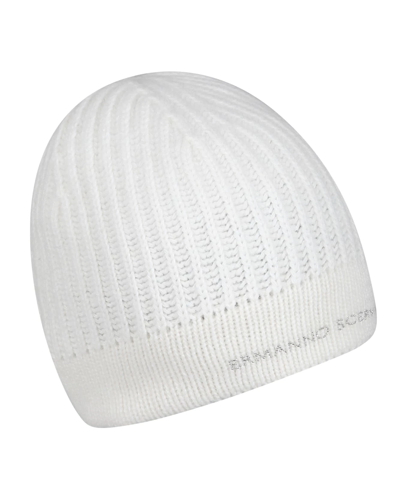 White ribbed hat, in wool blend. It is embellished with rhinestone logo on the front.