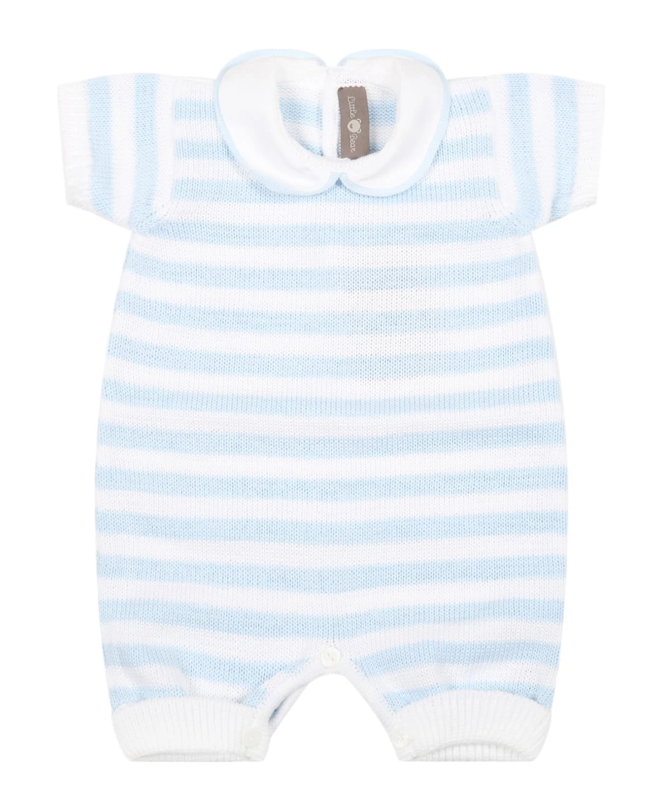 White and light blue striped romper, with short sleeves, white peter pan cotton poplin collar, and closure with mother-of-pearl buttons on the back and between the legs. It is advisable to carry out a delicate hand wash and dry on a flat surface, not exposing the garments to the sun’s rays.