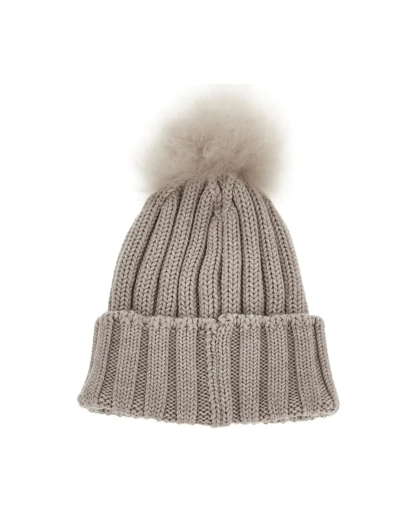Woolrich hat in light taupe virgin wool with top tonal fluffy pom pom and branded label stitched on the bottom hem.