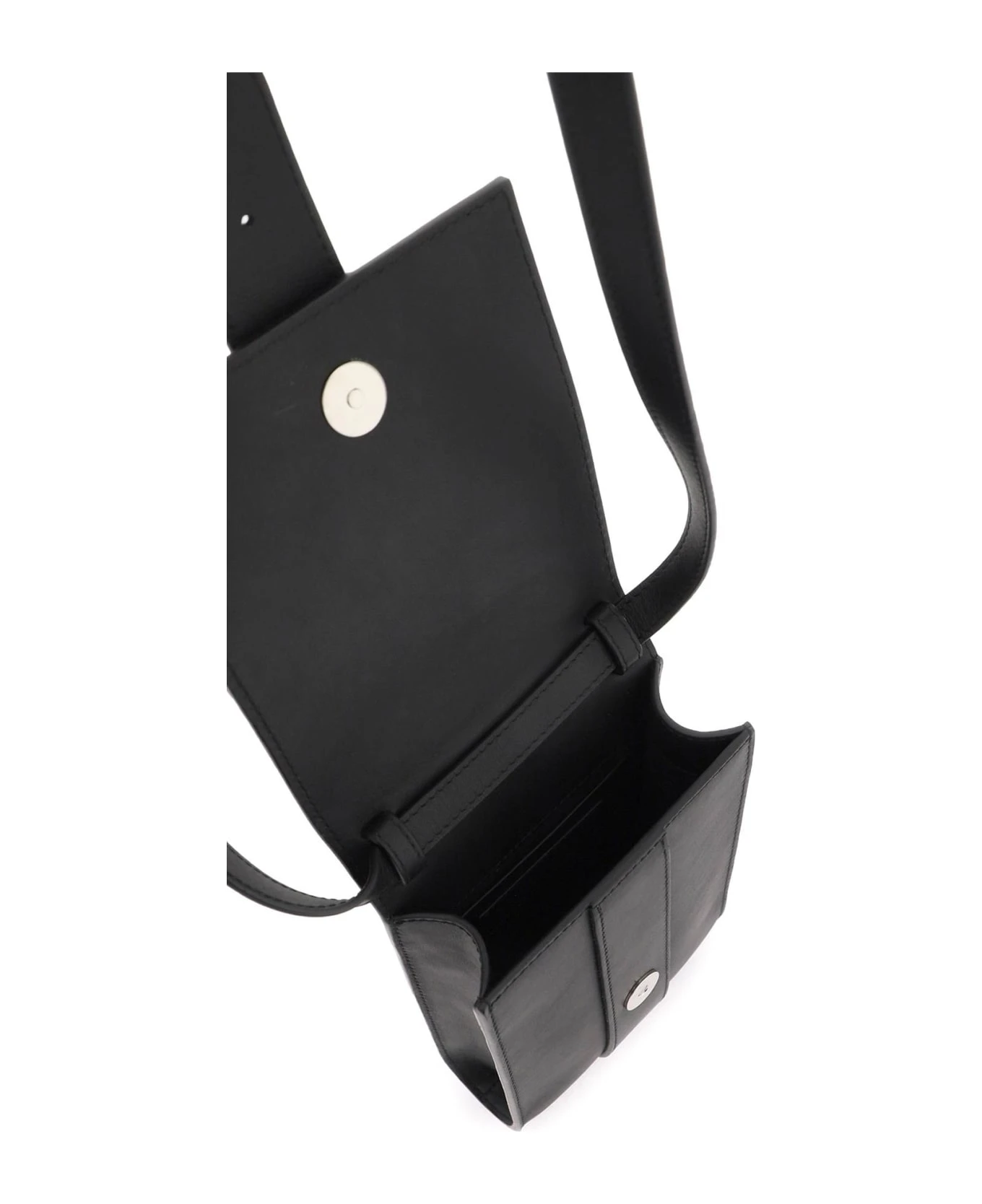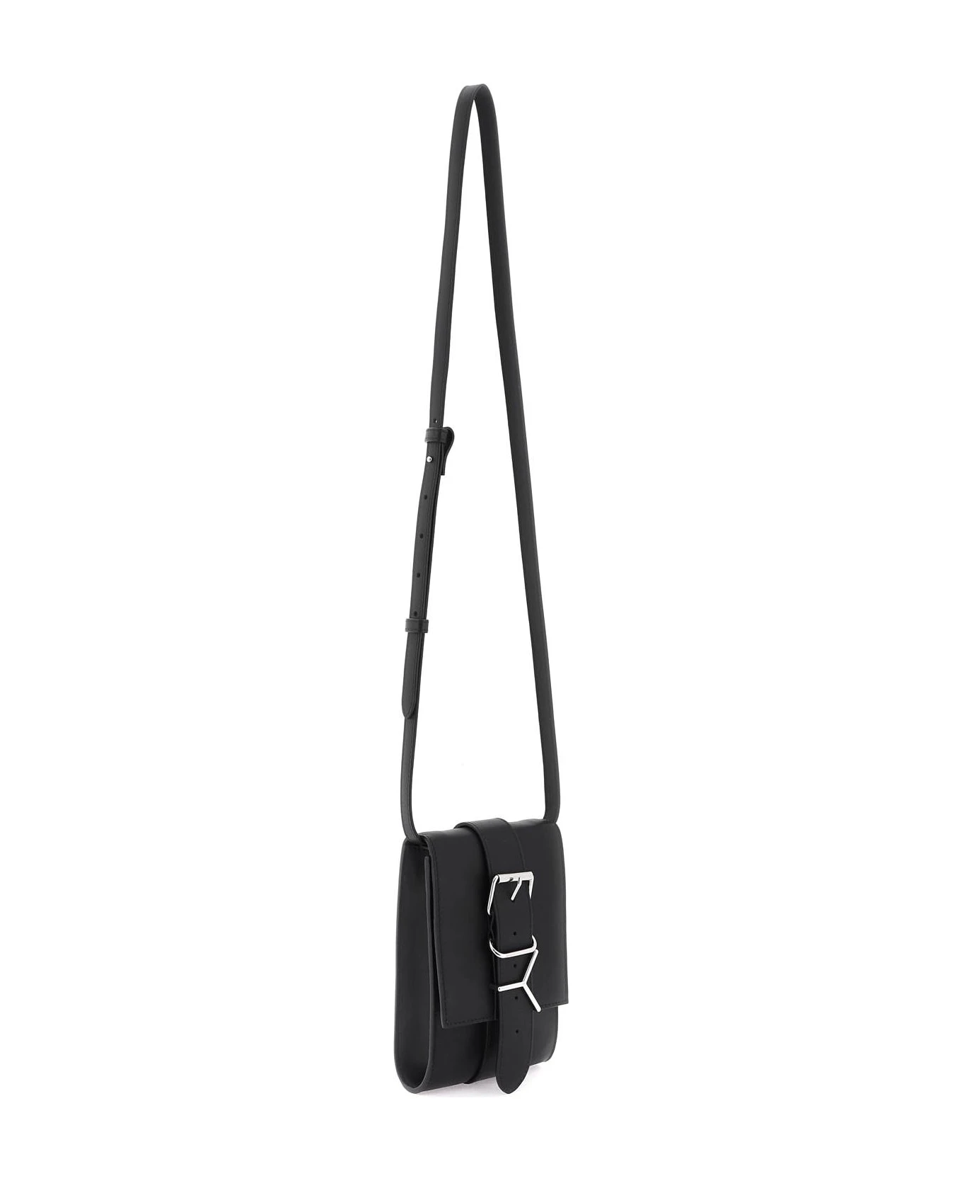 Leather crossbody bag by Y Project with a fake belt and Y buckle applied on the flap. Magentic closure, suede microfiber interior with a credit card slot and adjustable, detachable shoulder strap. Silver-finished metalware.